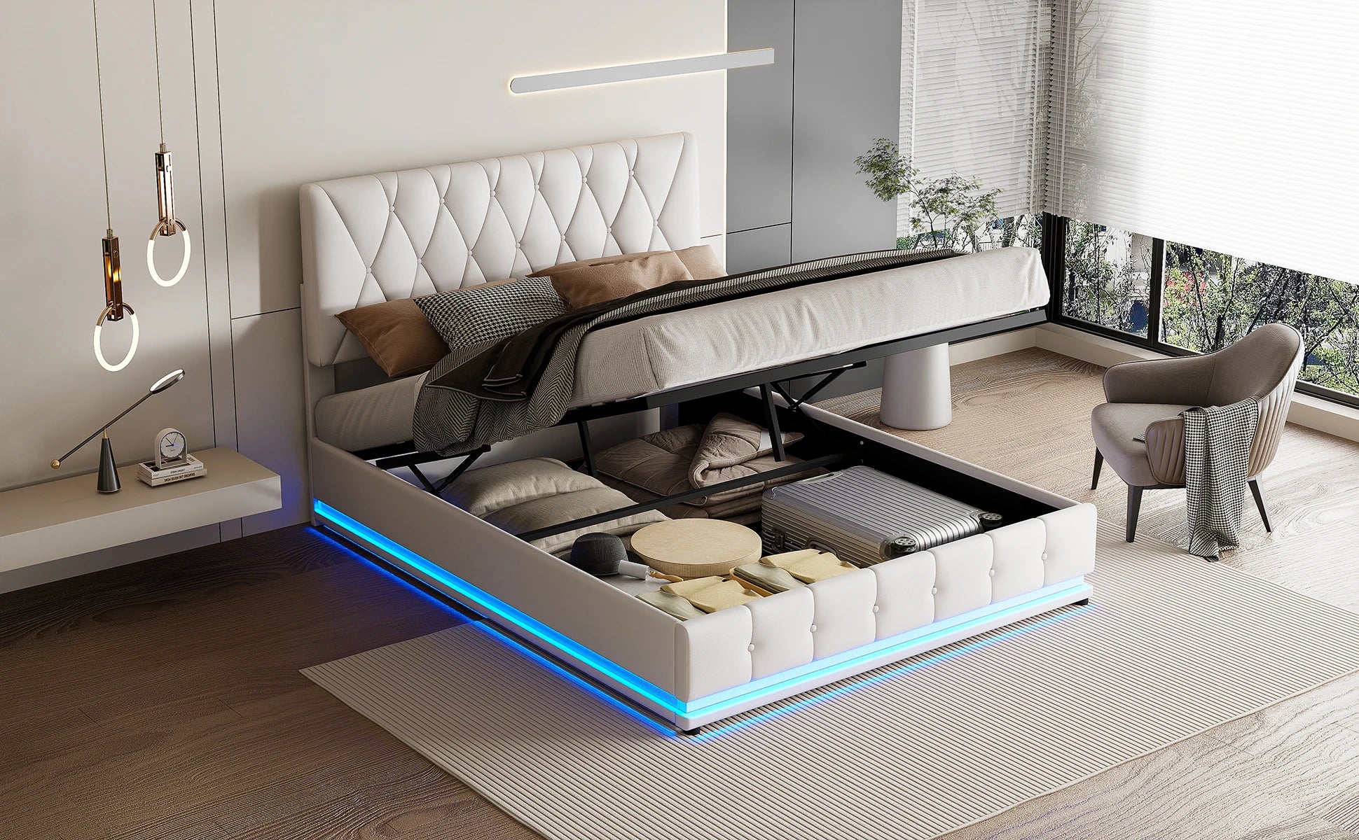 Rosahqnda Gepolstertes hydraulisches Bett 140 * 200 cm mit LED-verstellbarem Kopfteil, moderner Doppelbettrahmen mit Stauraum,PU