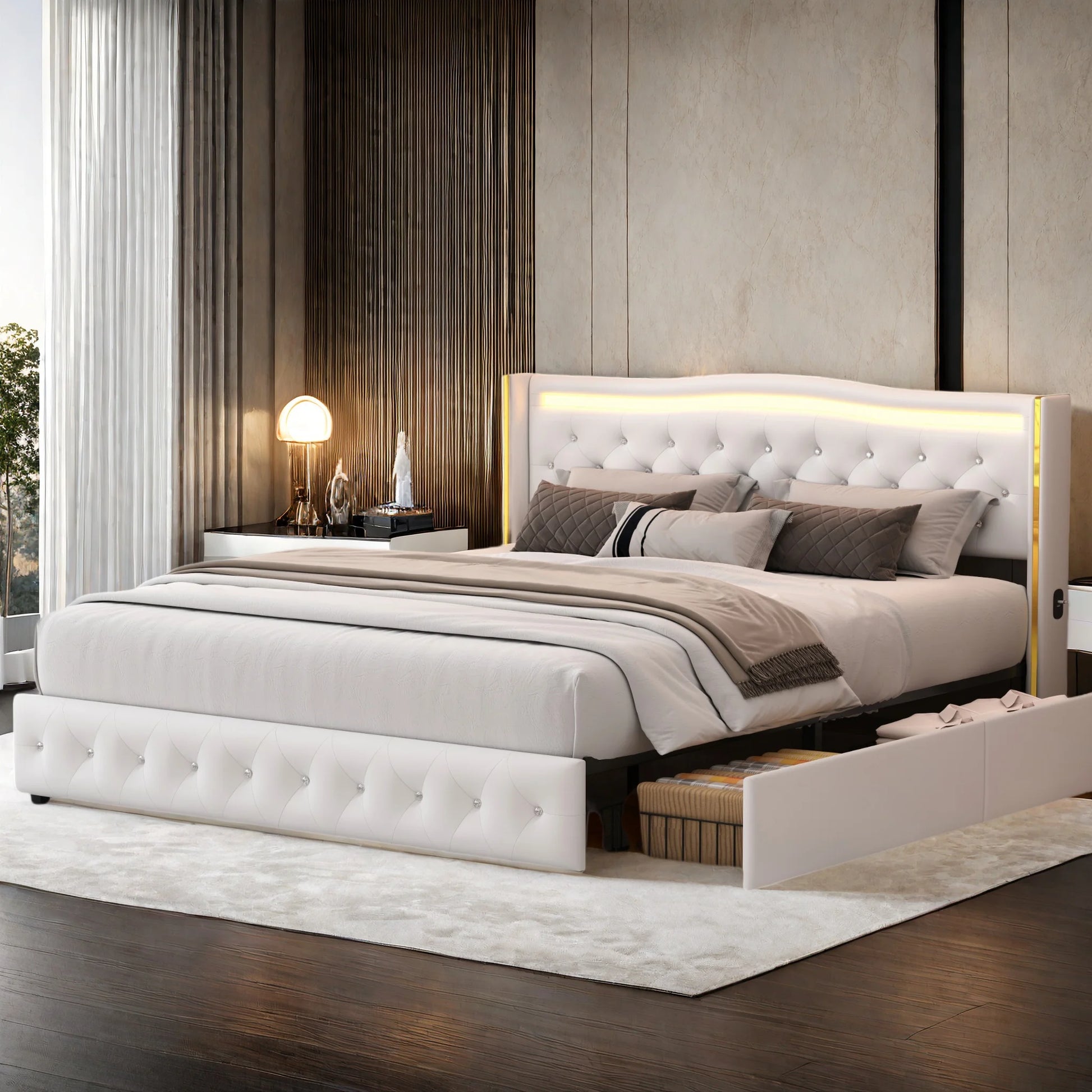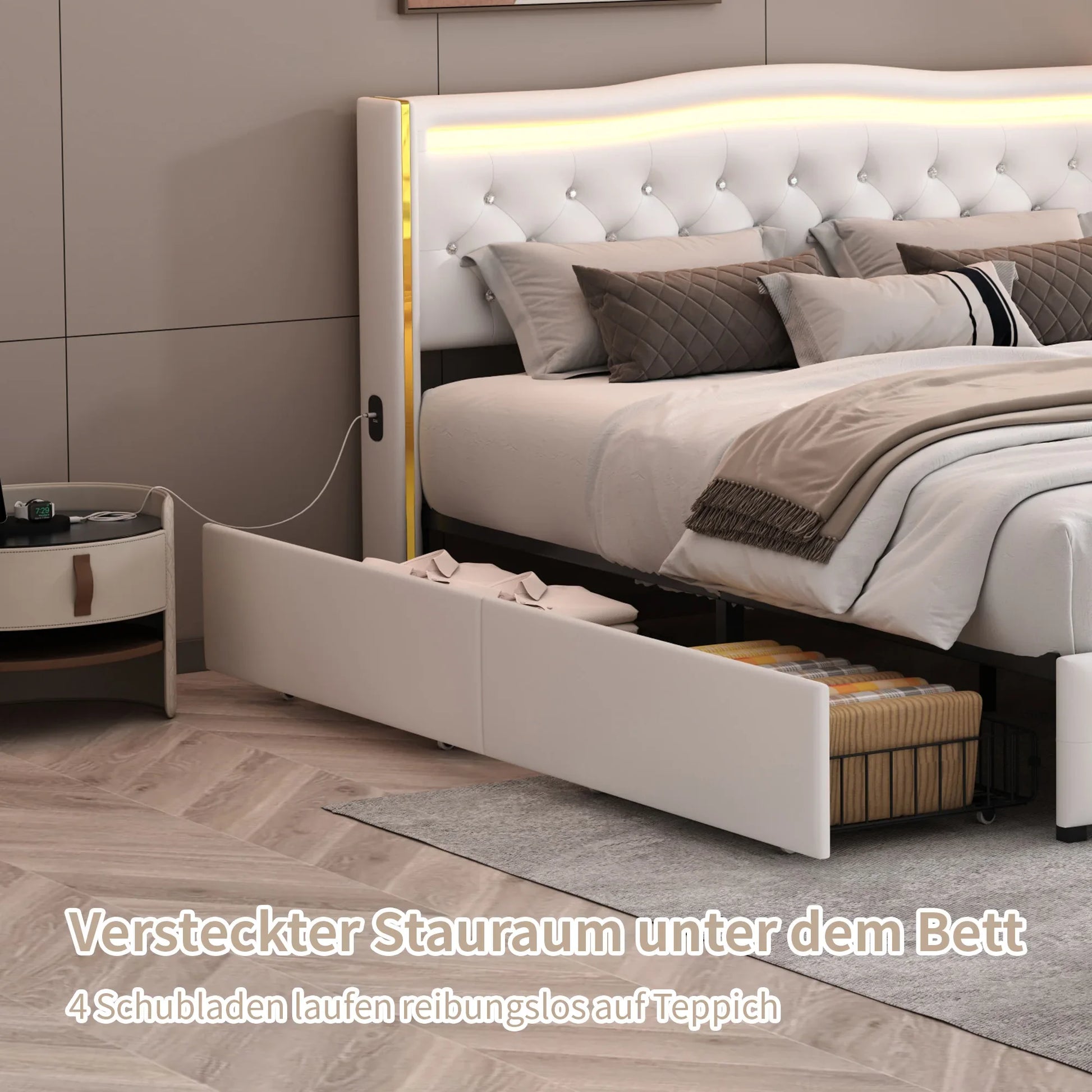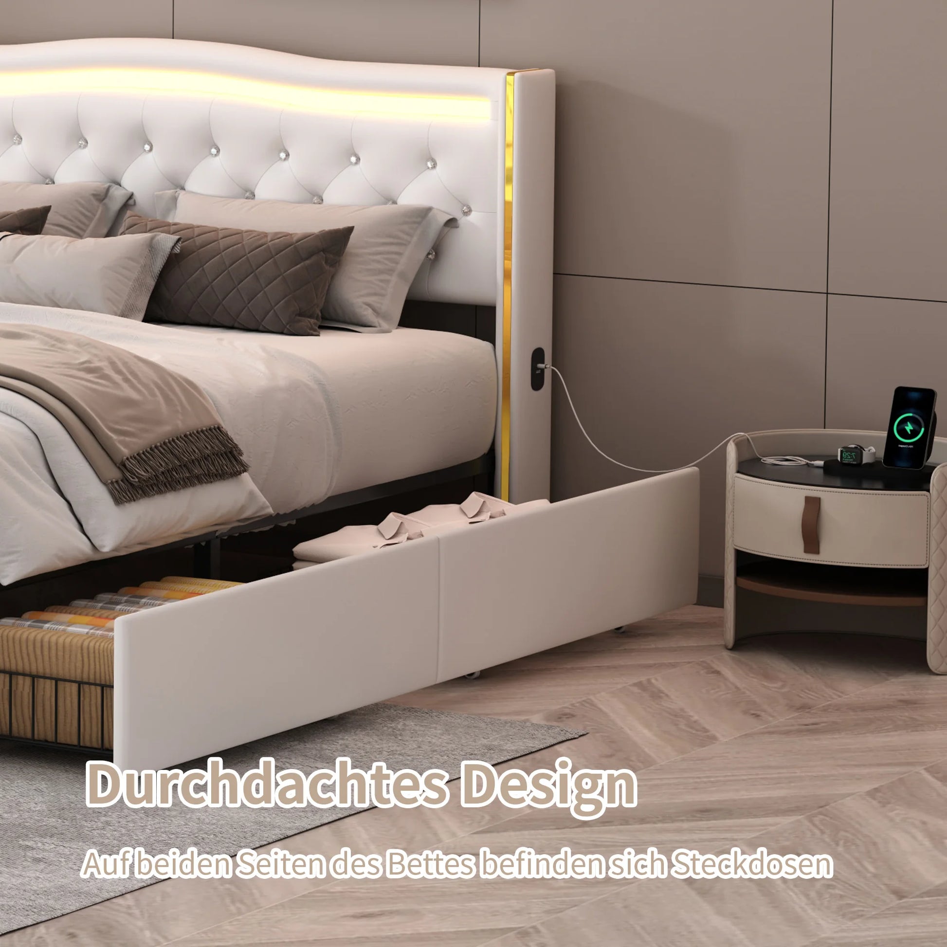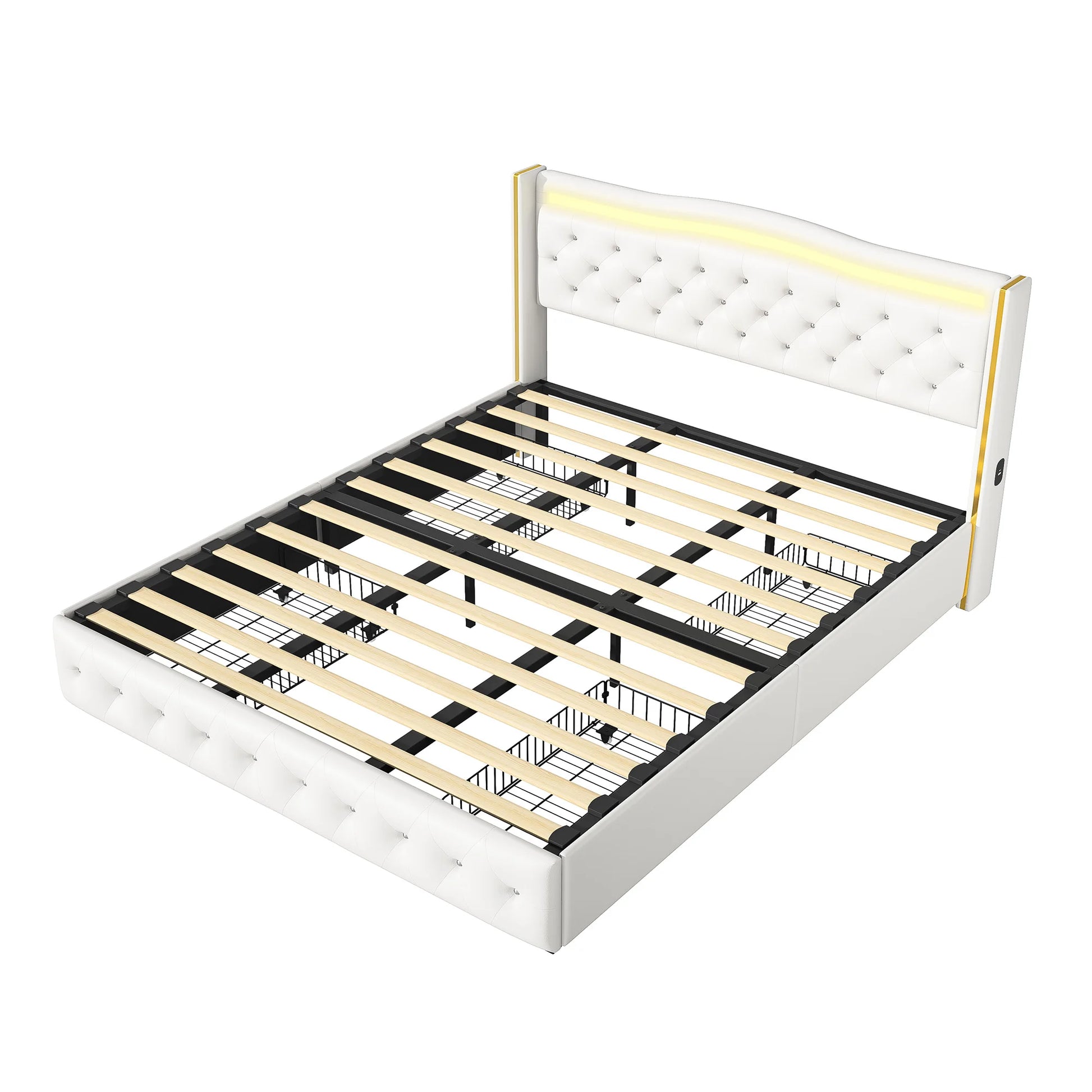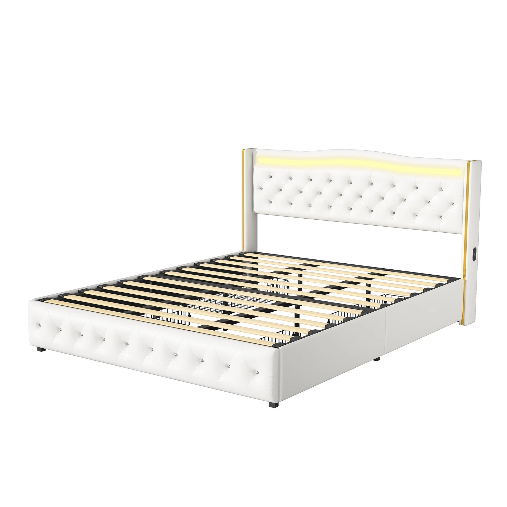Rosahqnda Modernes Doppelbettgestell aus weißem PU-Leder, vergoldetes Kopfteil mit vier Schubladen ohne Matratze