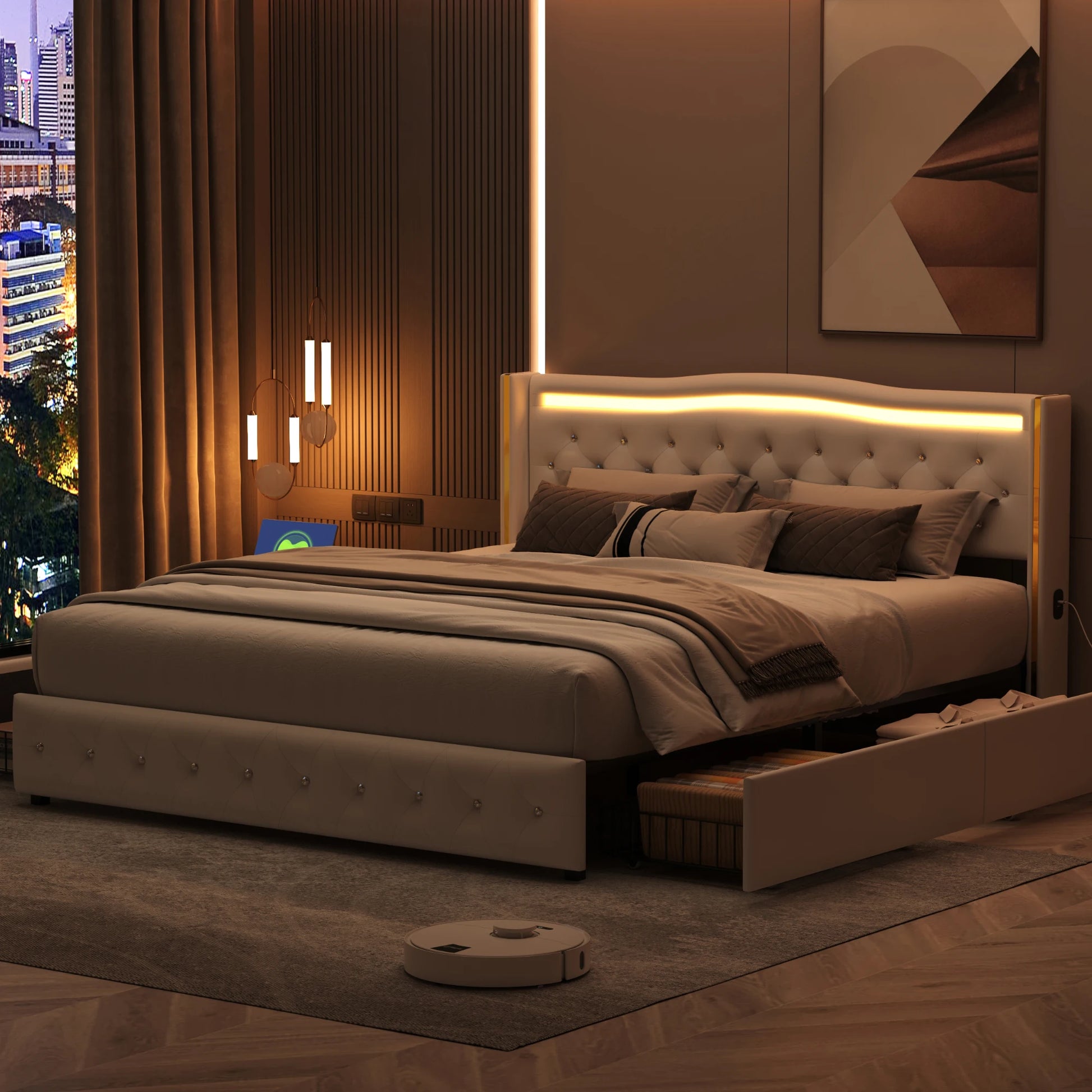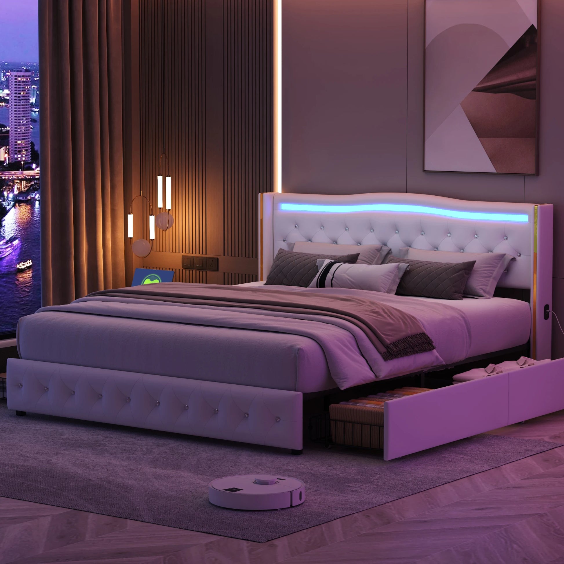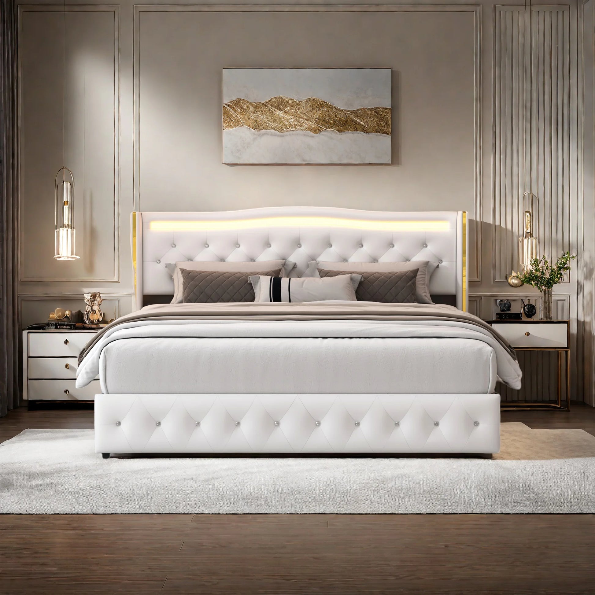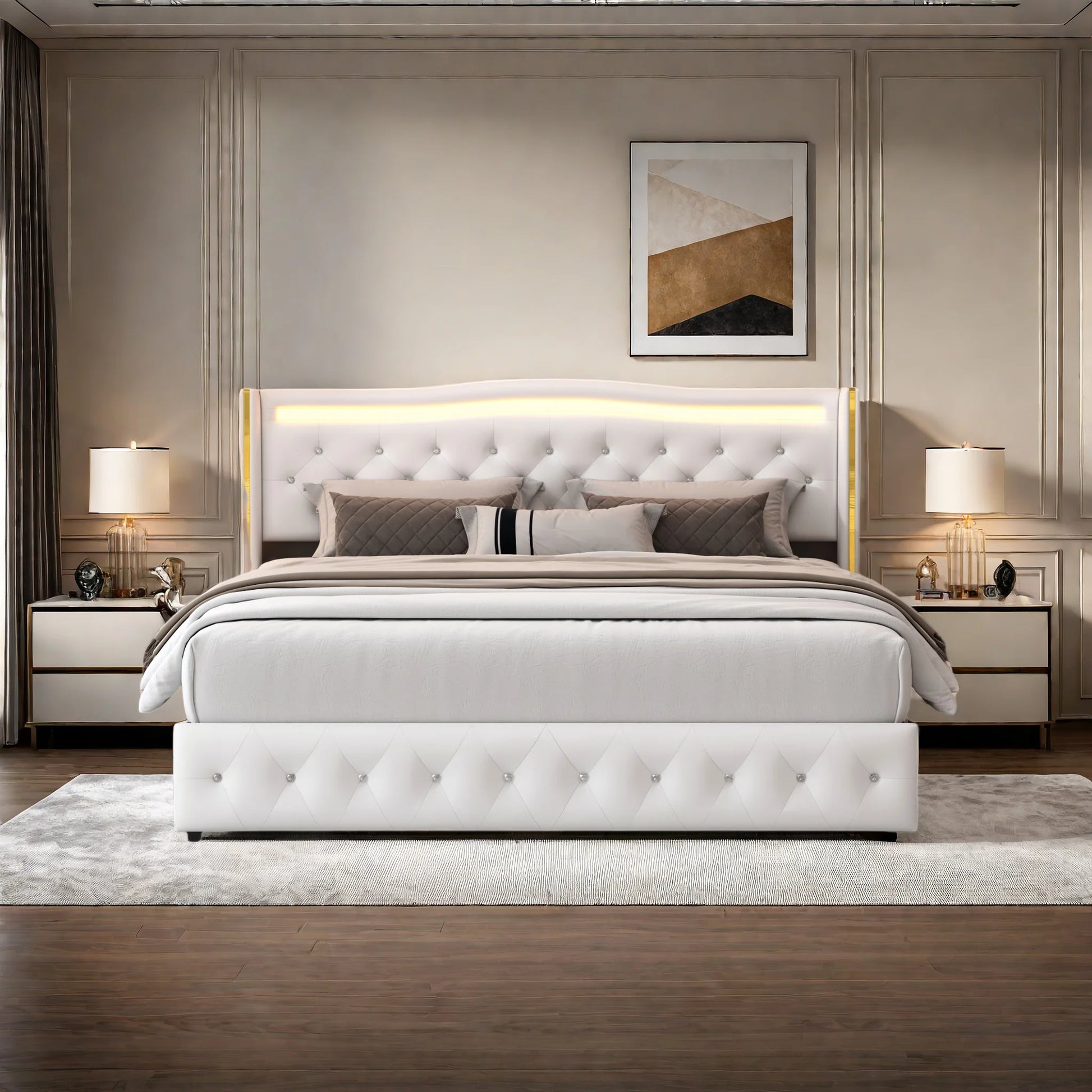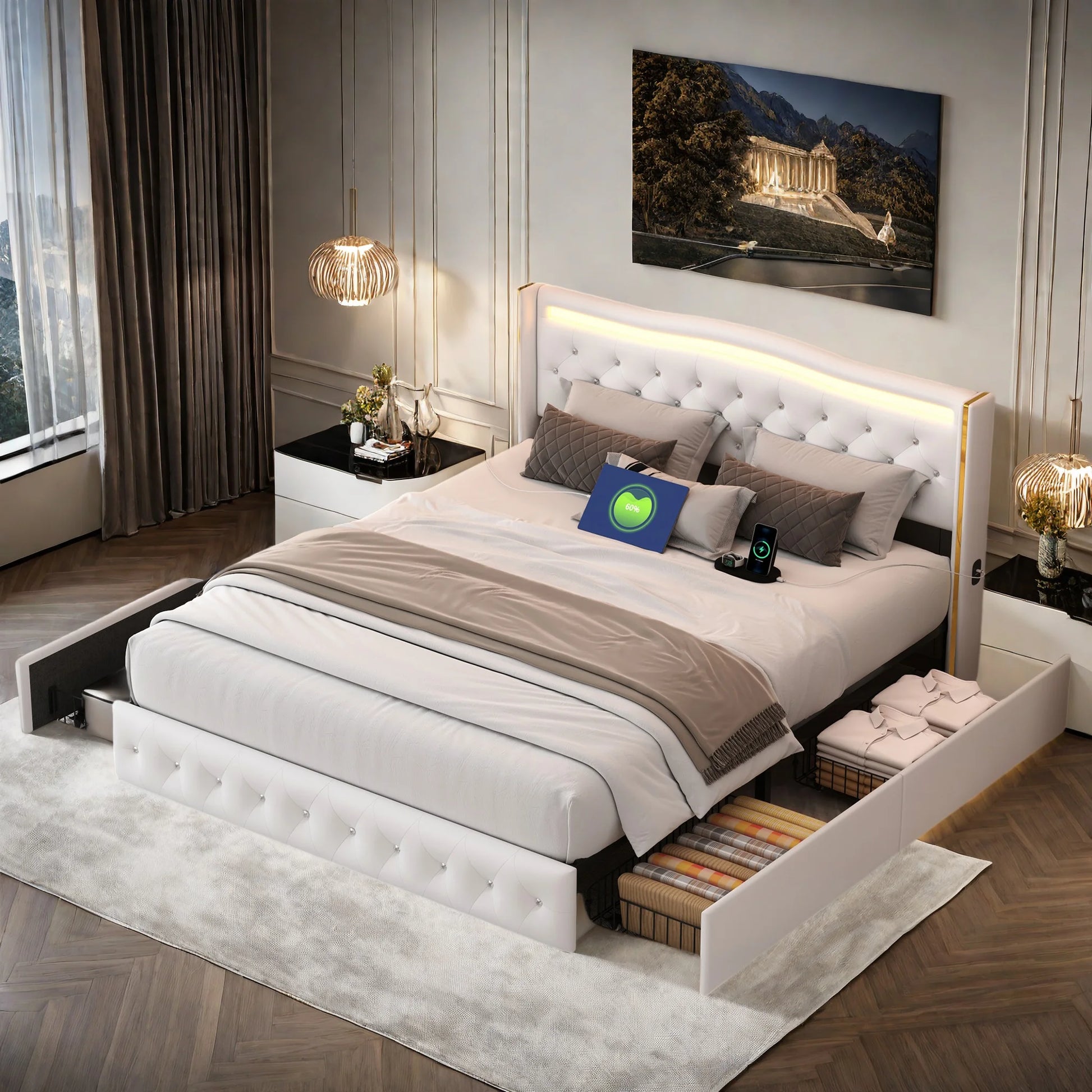 Rosahqnda Modernes Doppelbettgestell aus weißem PU-Leder, vergoldetes Kopfteil mit vier Schubladen ohne Matratze