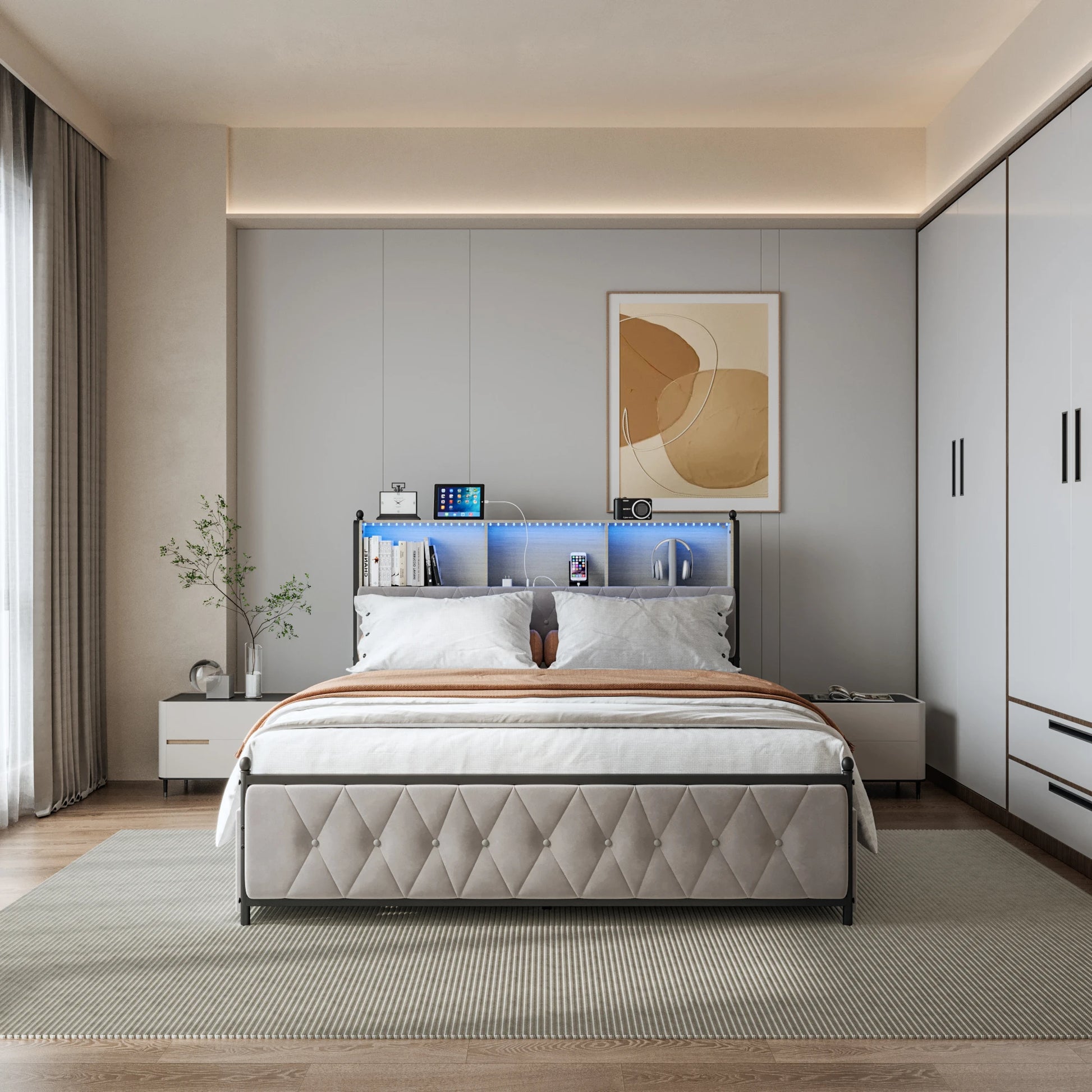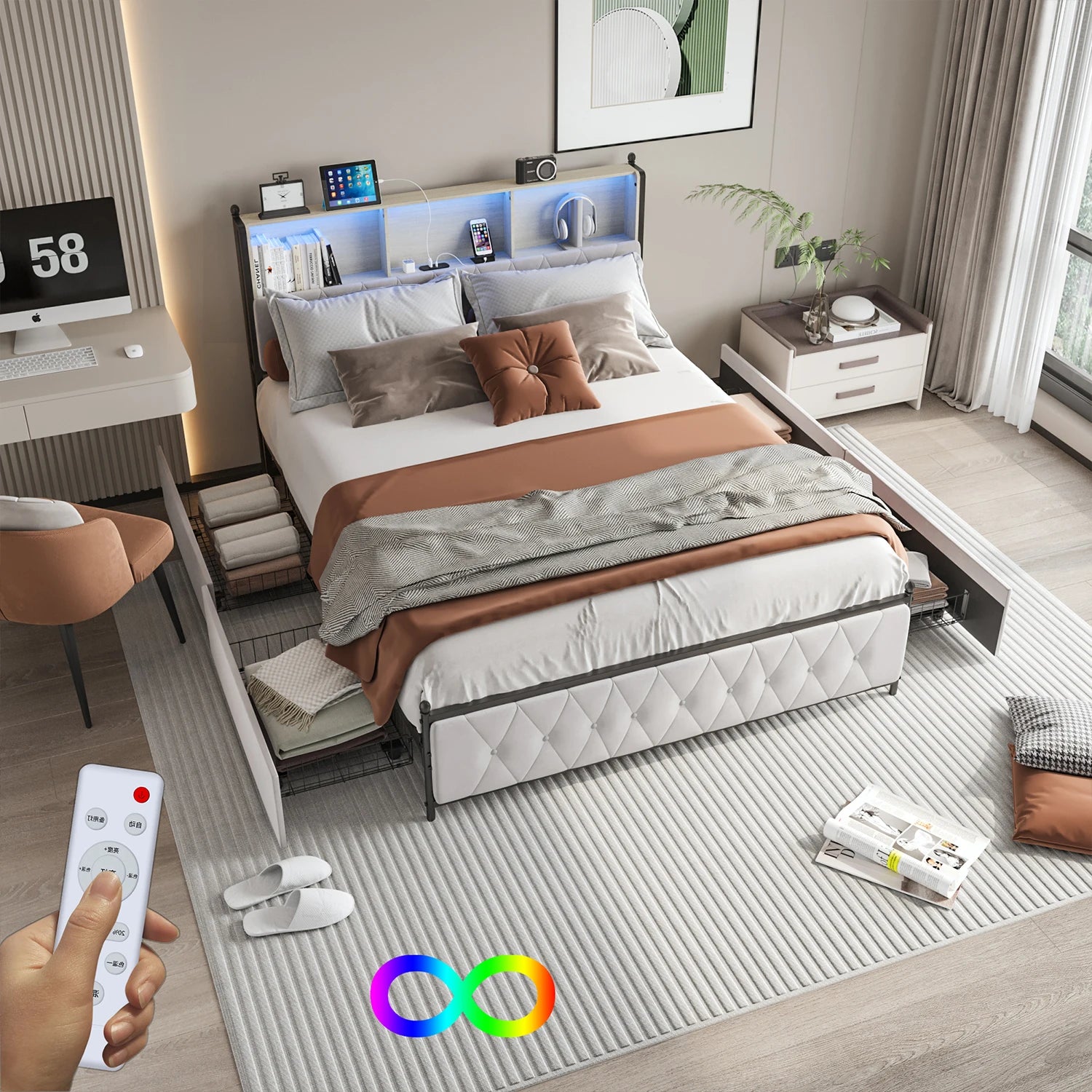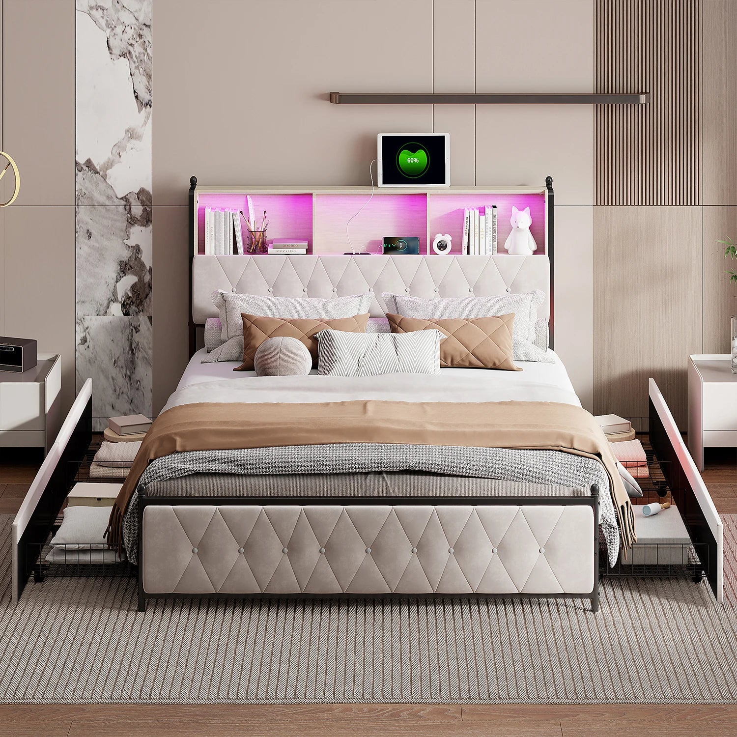 ROSAHQNDA Modernes gepolstertes Bettgestell mit Schubladen, LED-Bücherregal-Kopfteil mit USB-Anschlüssen, 140/160/180 cm, ohne Matratze