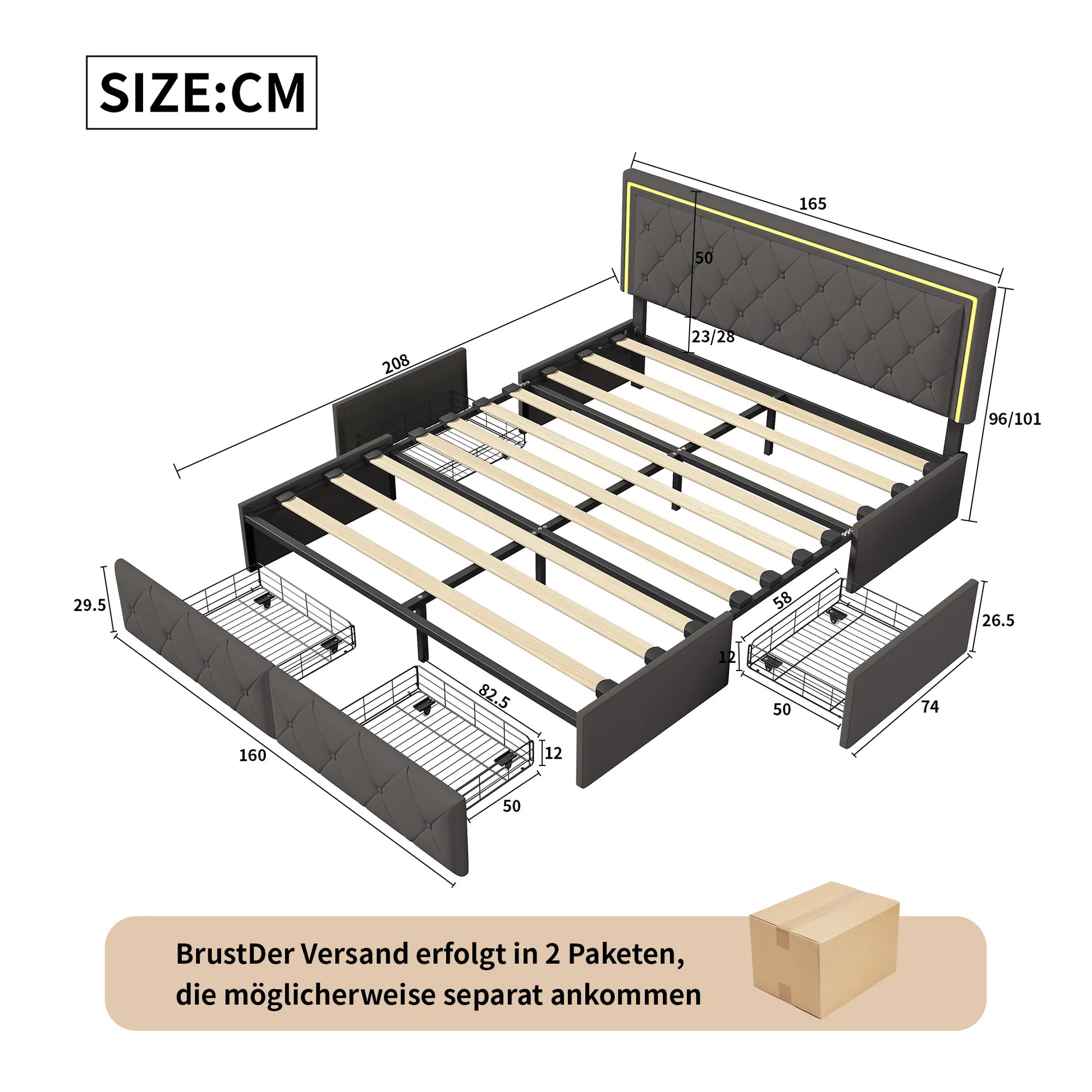 ROSAHQNDA Modernes Kunstlederbett mit Schubladen, LED-PU-Doppelbettgestell mit Stauraum, 140/160 x 200 cm, ohne Matratze