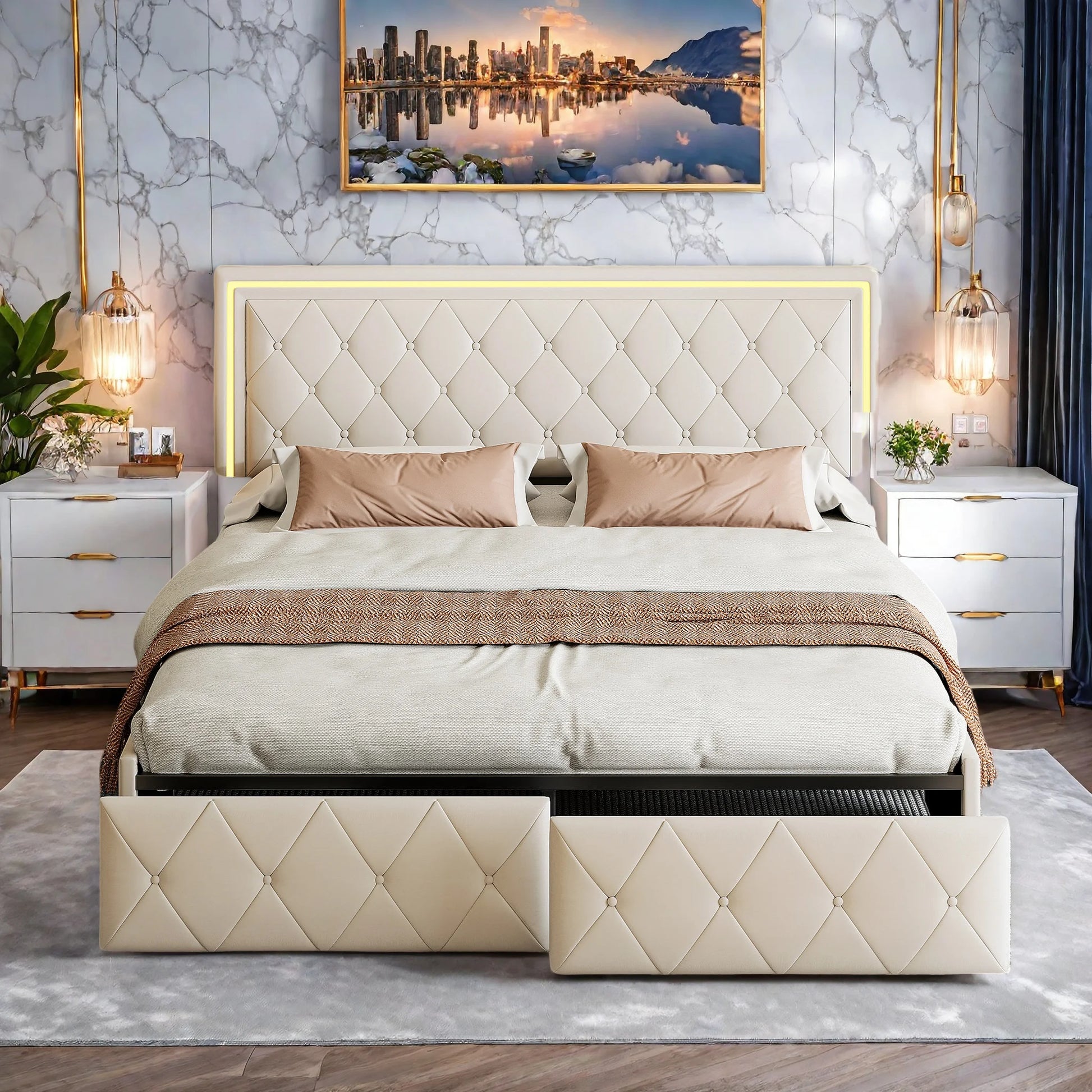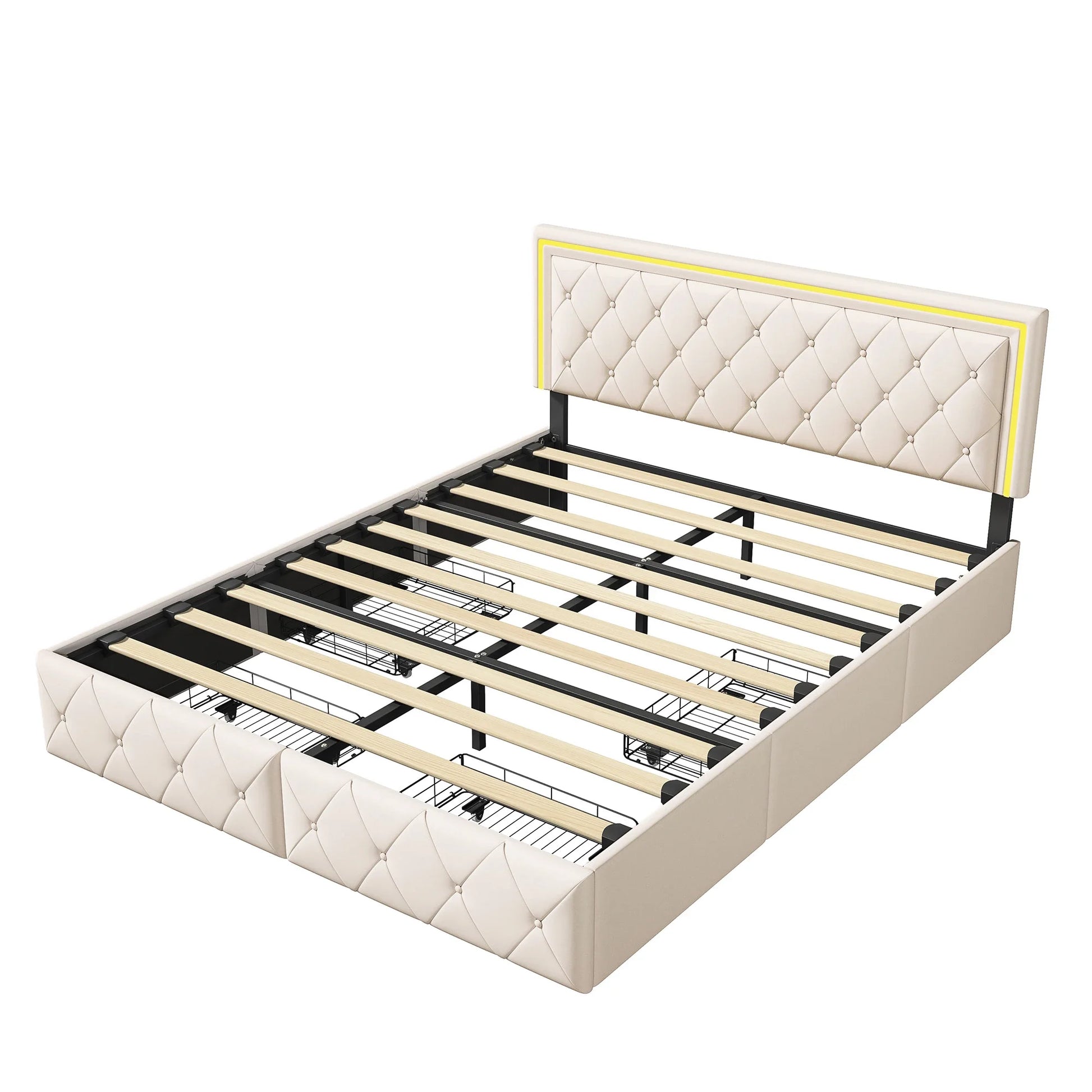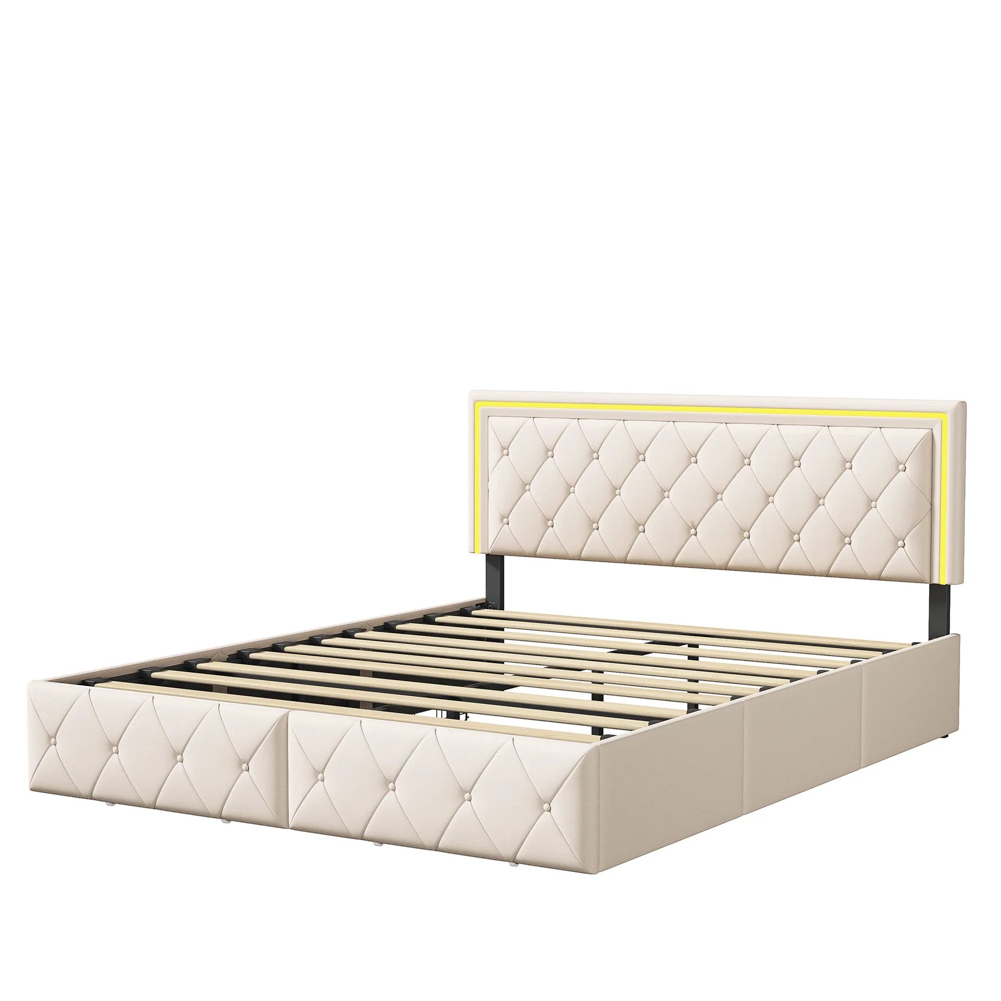 Rosahqnda Modernes Kunstlederbett mit Schubladen, stilvolles Doppelbett aus Kunstleder mit Stauraum, ohne Matratze