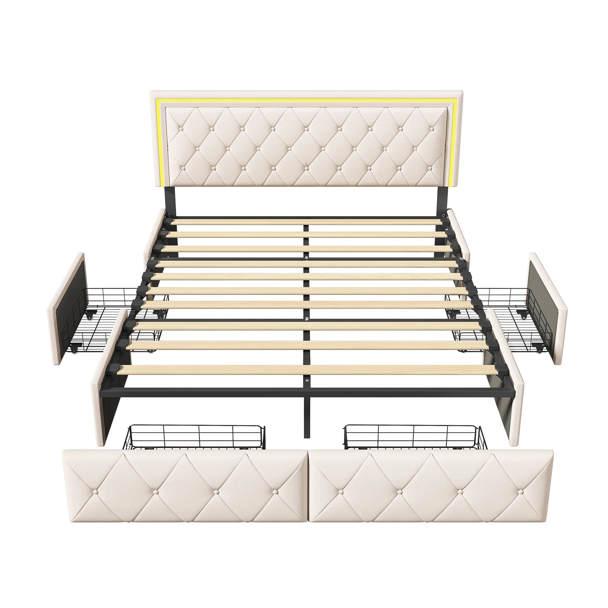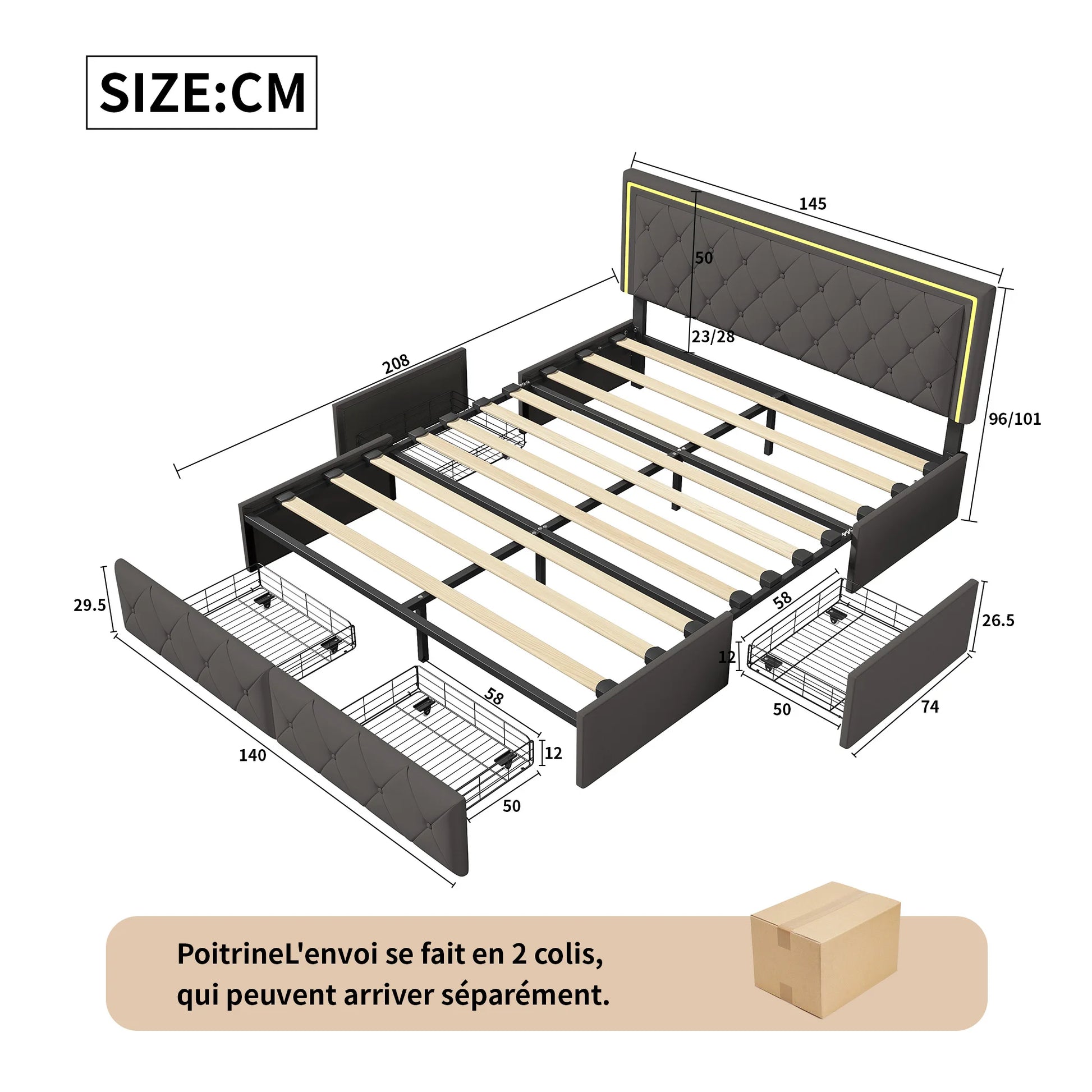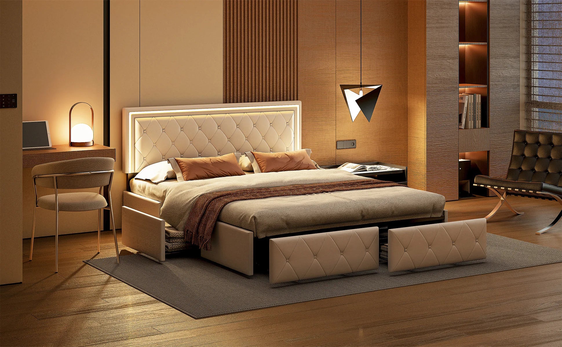 Rosahqnda Modernes Kunstlederbett mit Schubladen, stilvolles Doppelbett aus Kunstleder mit Stauraum, ohne Matratze