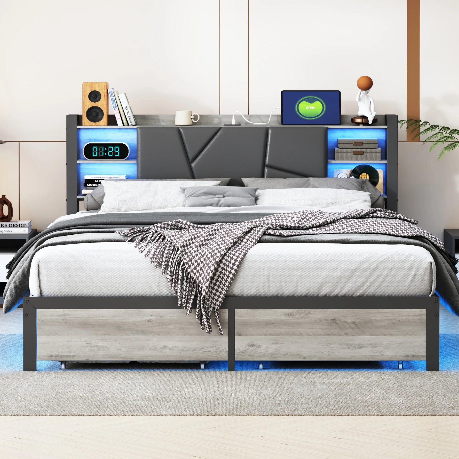 ROSAHQNDA Modernes Polsterbett mit Schubladen, LED-Doppelbettrahmen aus PU-Leder und Eisen mit USB-Ladeanschluss, ohne Matratze