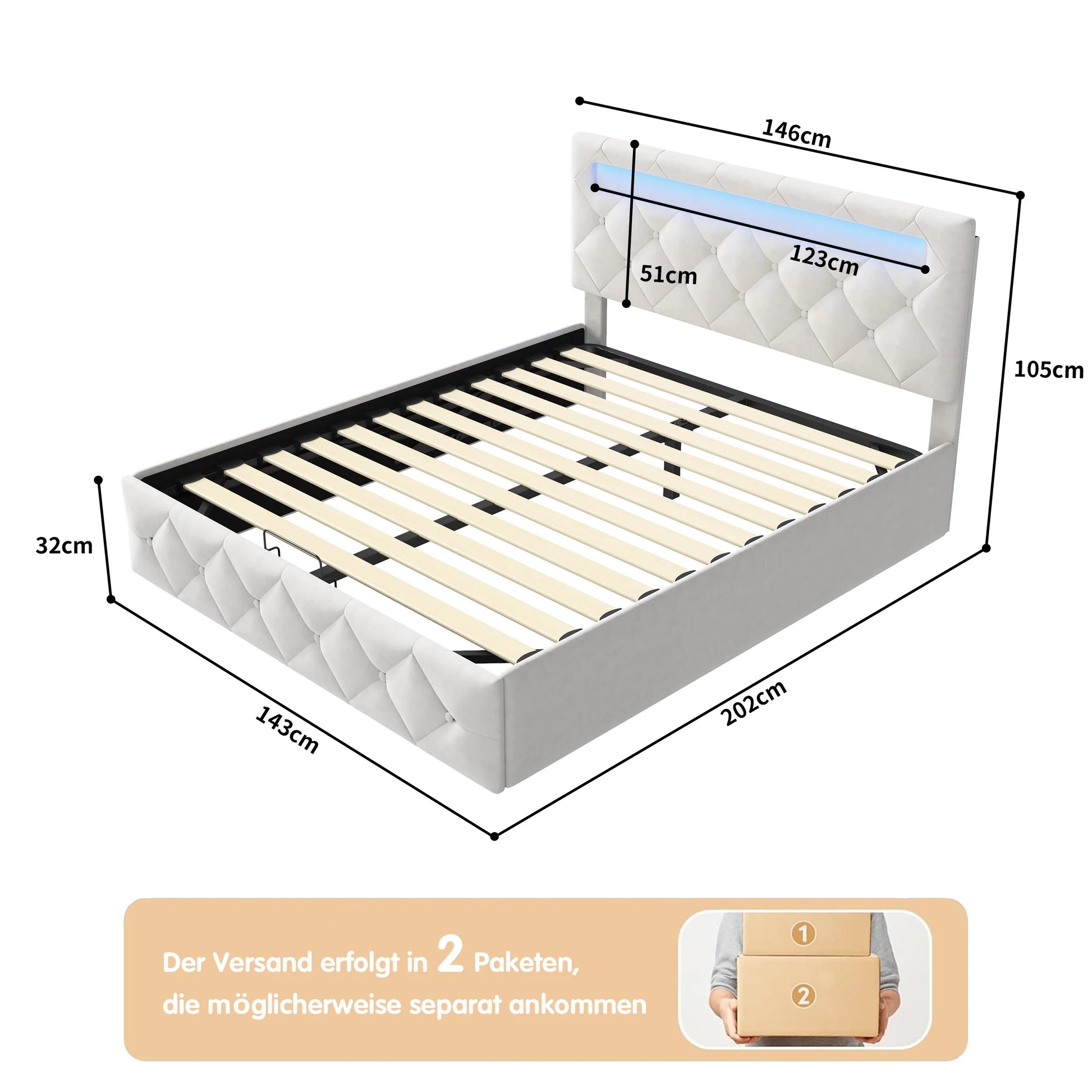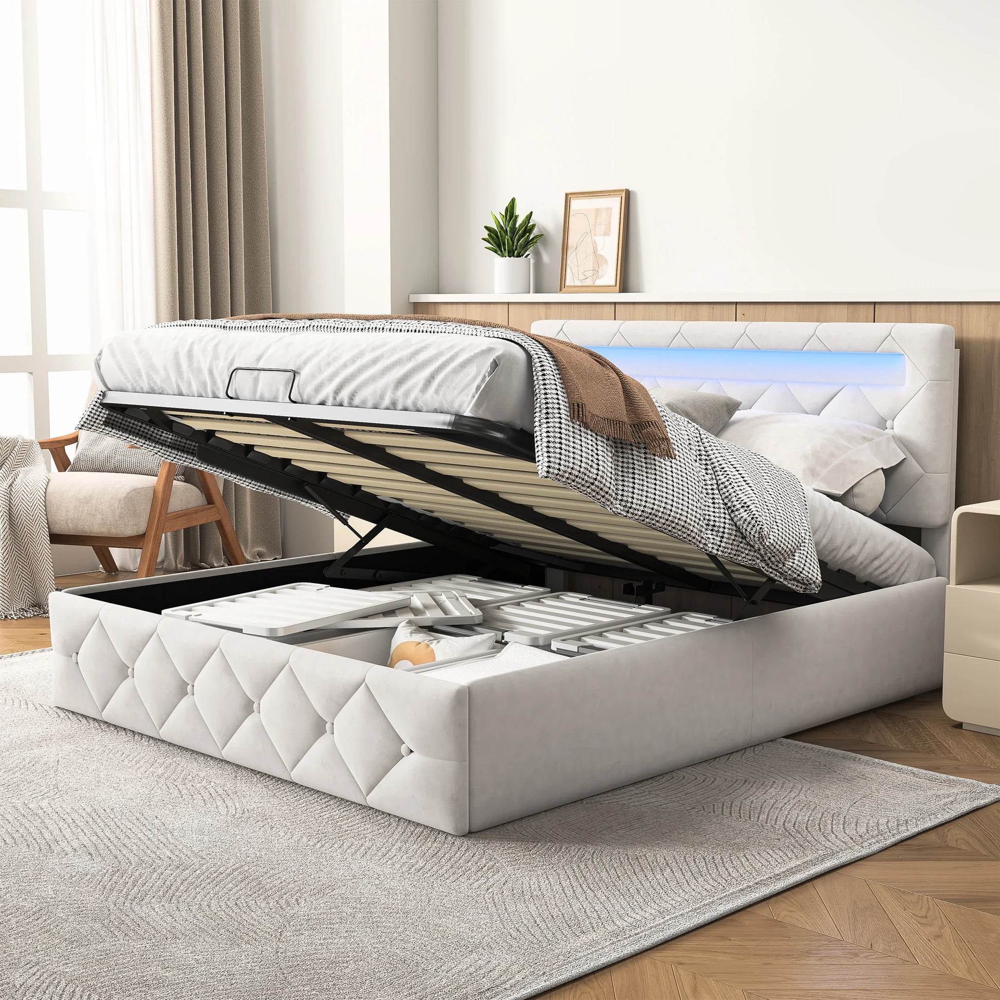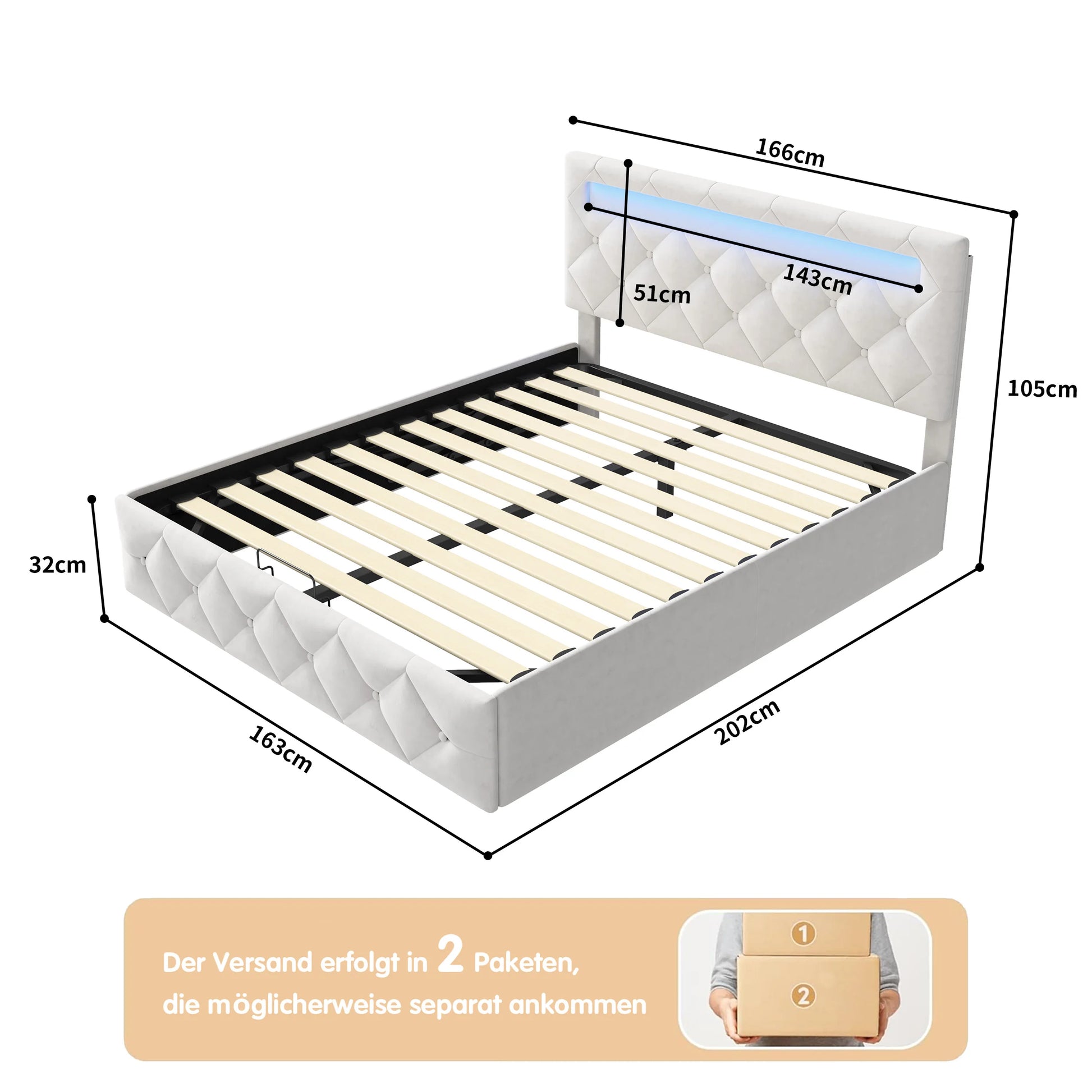 Rosahqnda Modernes weißes Polsterbett,hydraulisches Bett mit großem Stauraum, elegantes Doppelbett,Samtstoff, ohne Matratze