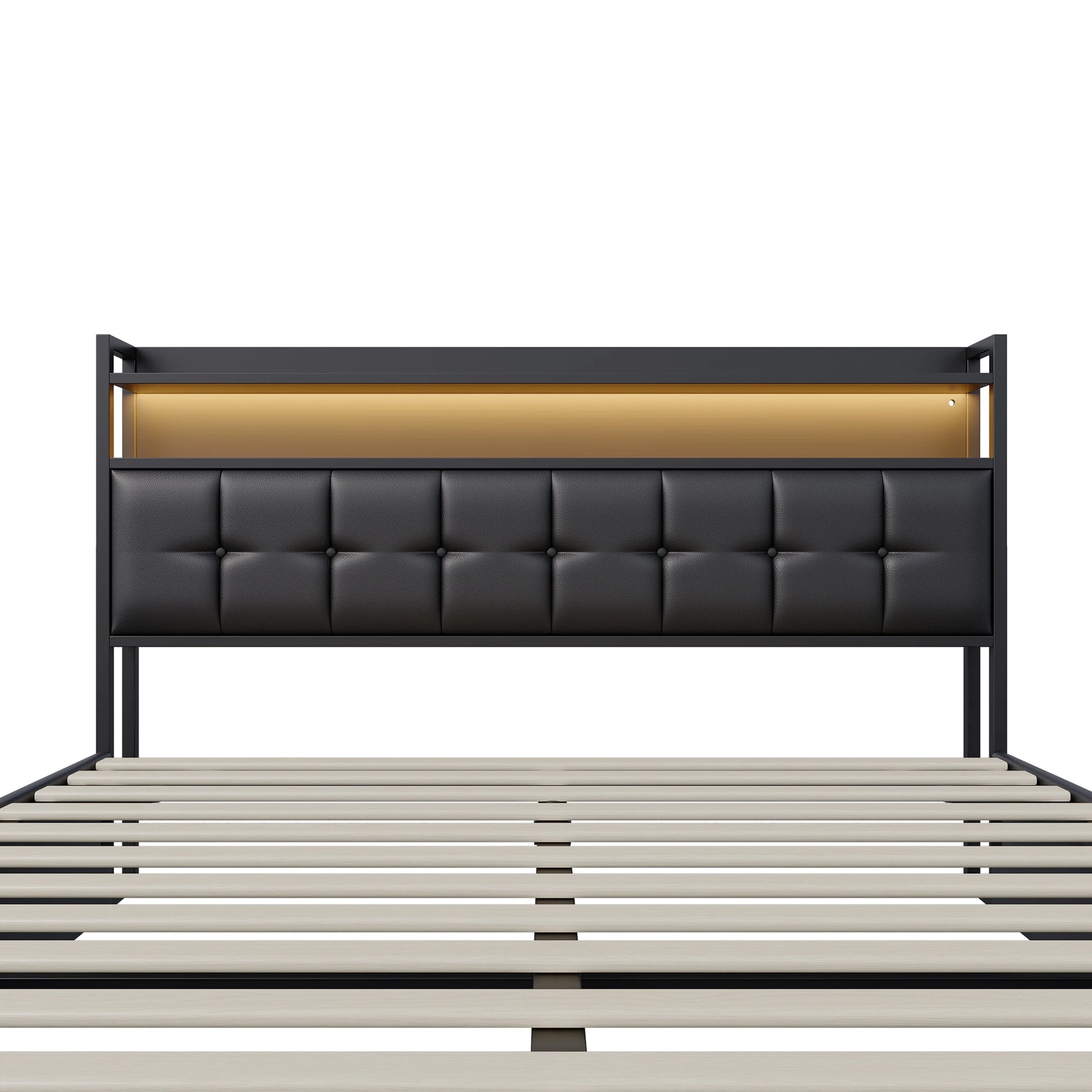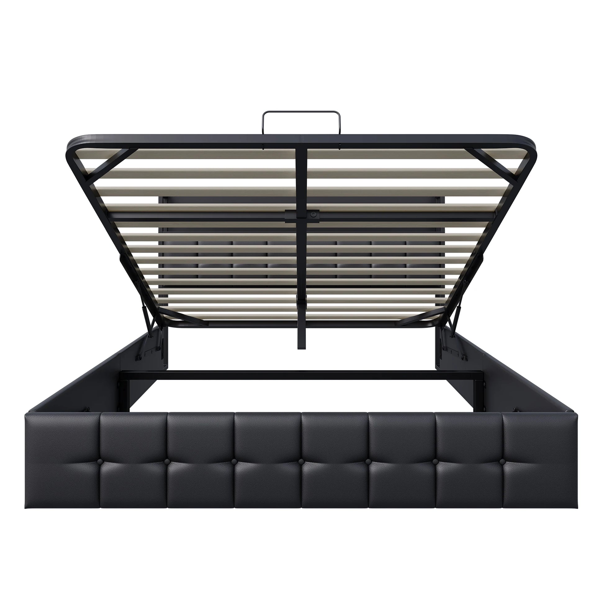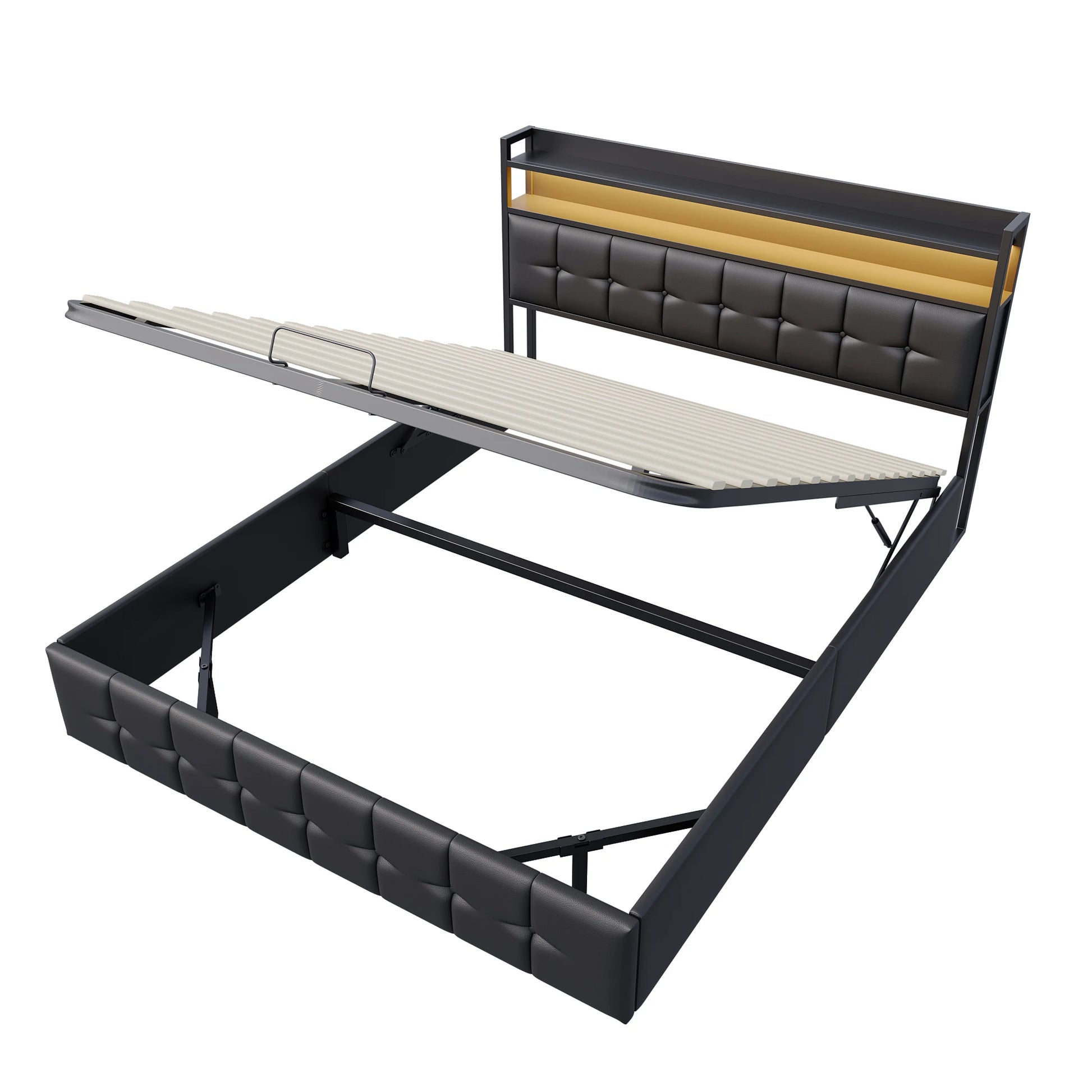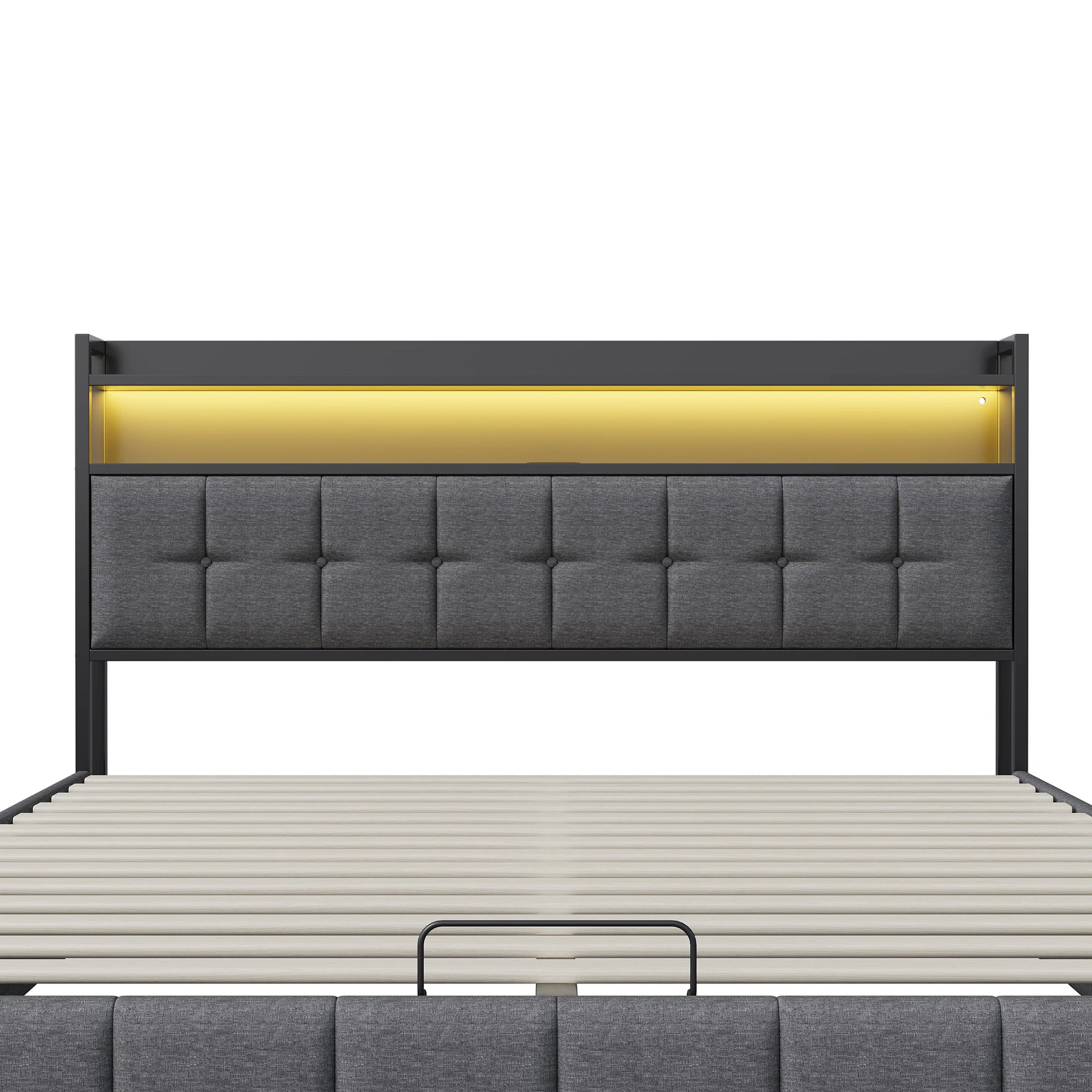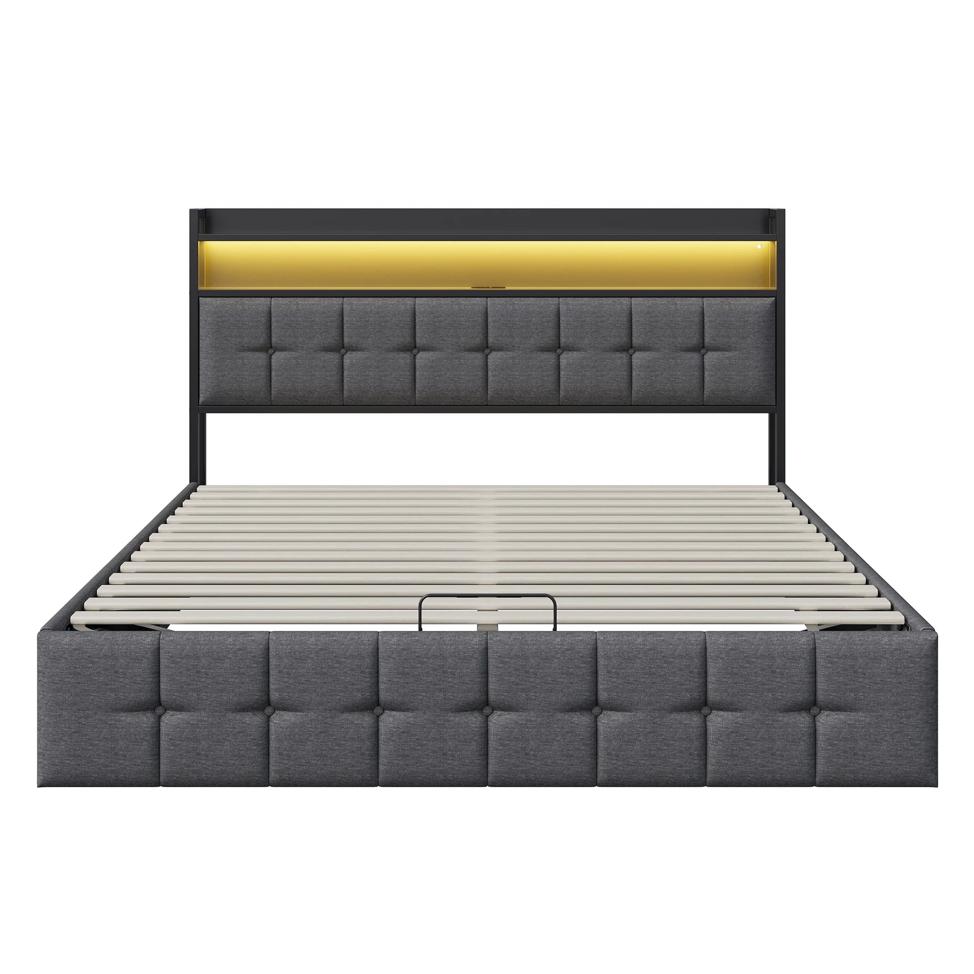 Rosahqnda Multifunctional Double Bed,Rechargeable,LED and Hydraulic Storage,Teen Bed,140/160 x 200 cm,Linen/PU,Grey,Black.