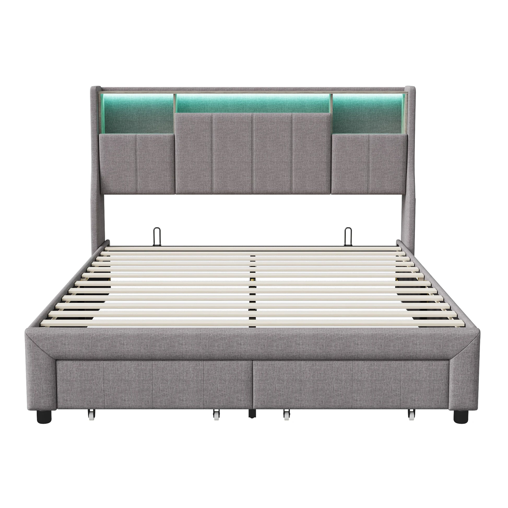 Rosahqnda Polsterbett 140/160 x 200 cm mit LED, USB, Schubladen, Kopfteil mit Stauraum, Gästebett, Wohnmännerbett, Leinen für Erwachsene/Teenager,
