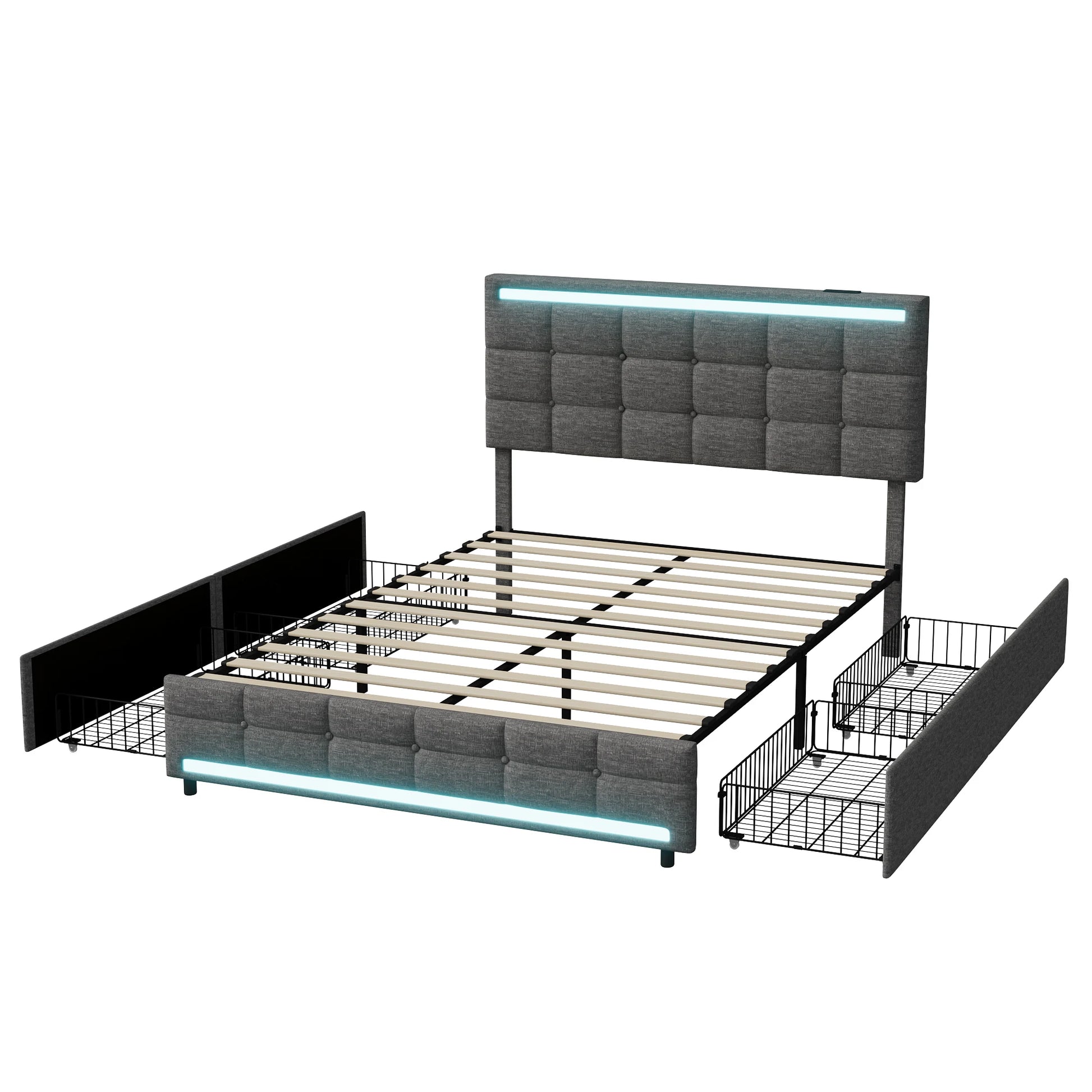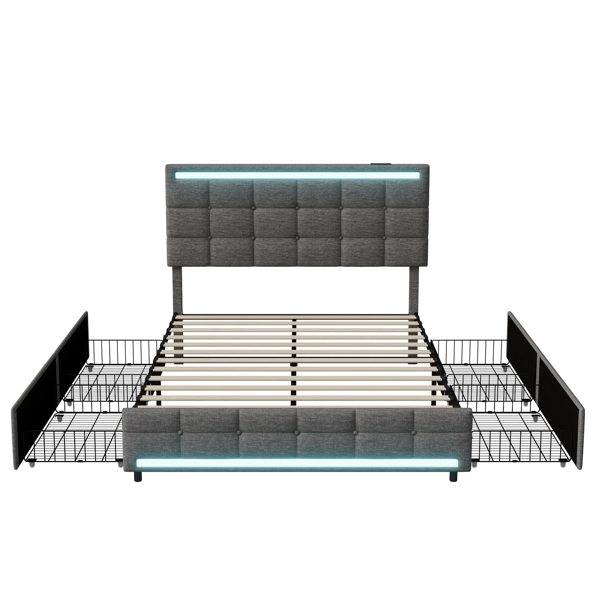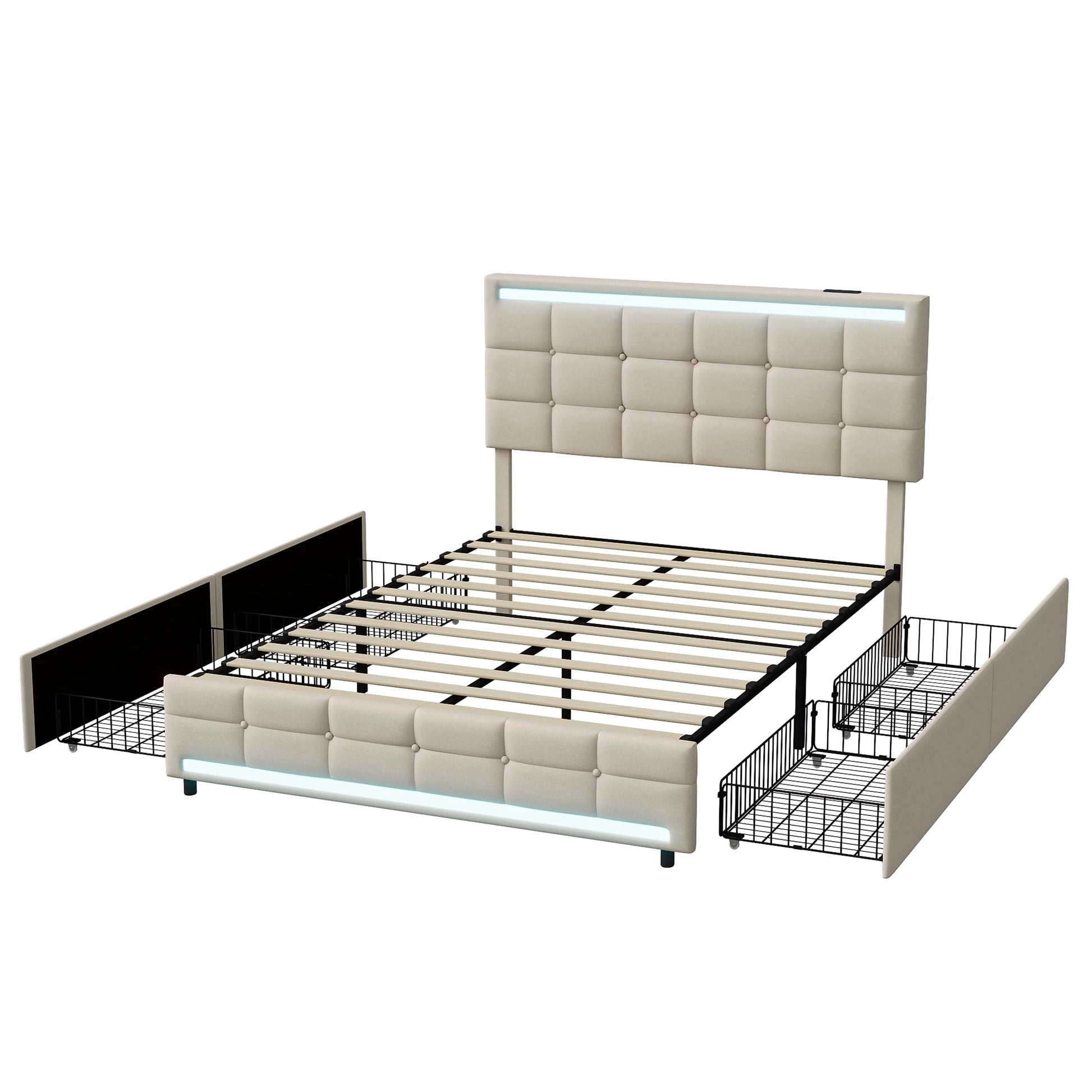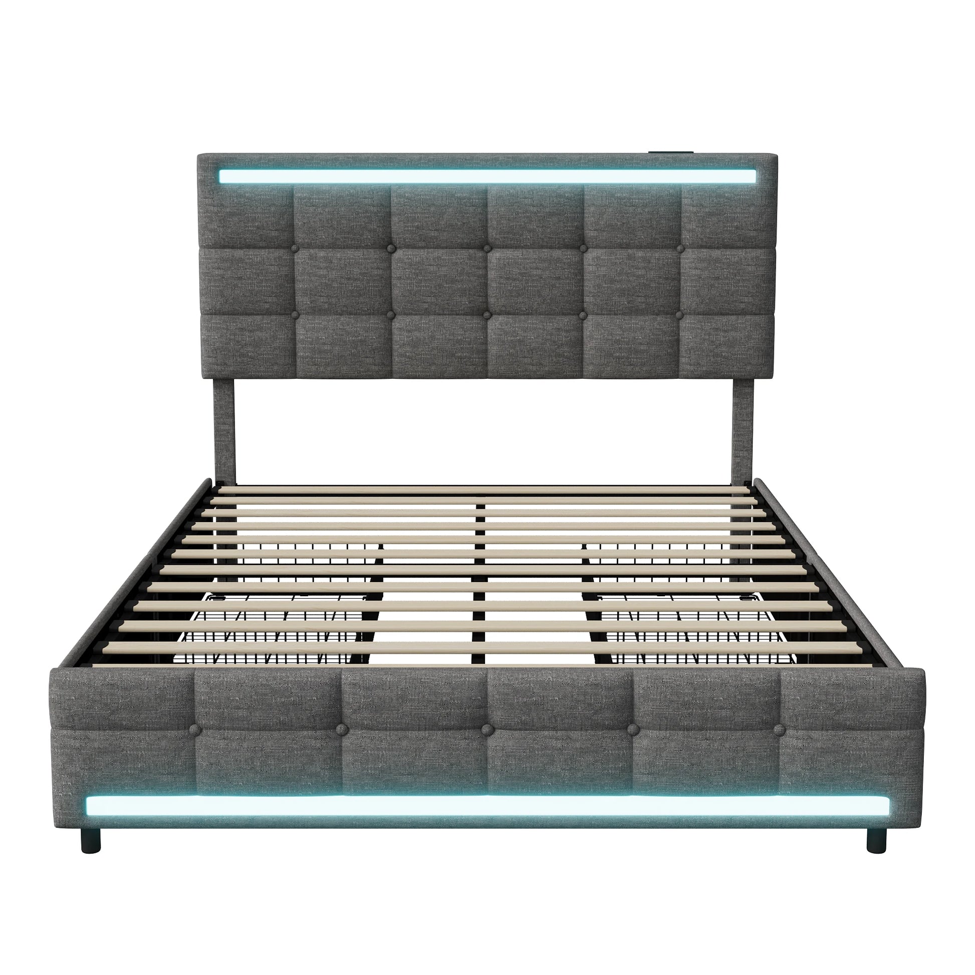 Rosahqnda Polsterbett mit 4 Schubladen und 2 USB-Anschlüssen, Bettrahmen mit LED-Leuchten, Kopfteil, Fußteil und Stauraum