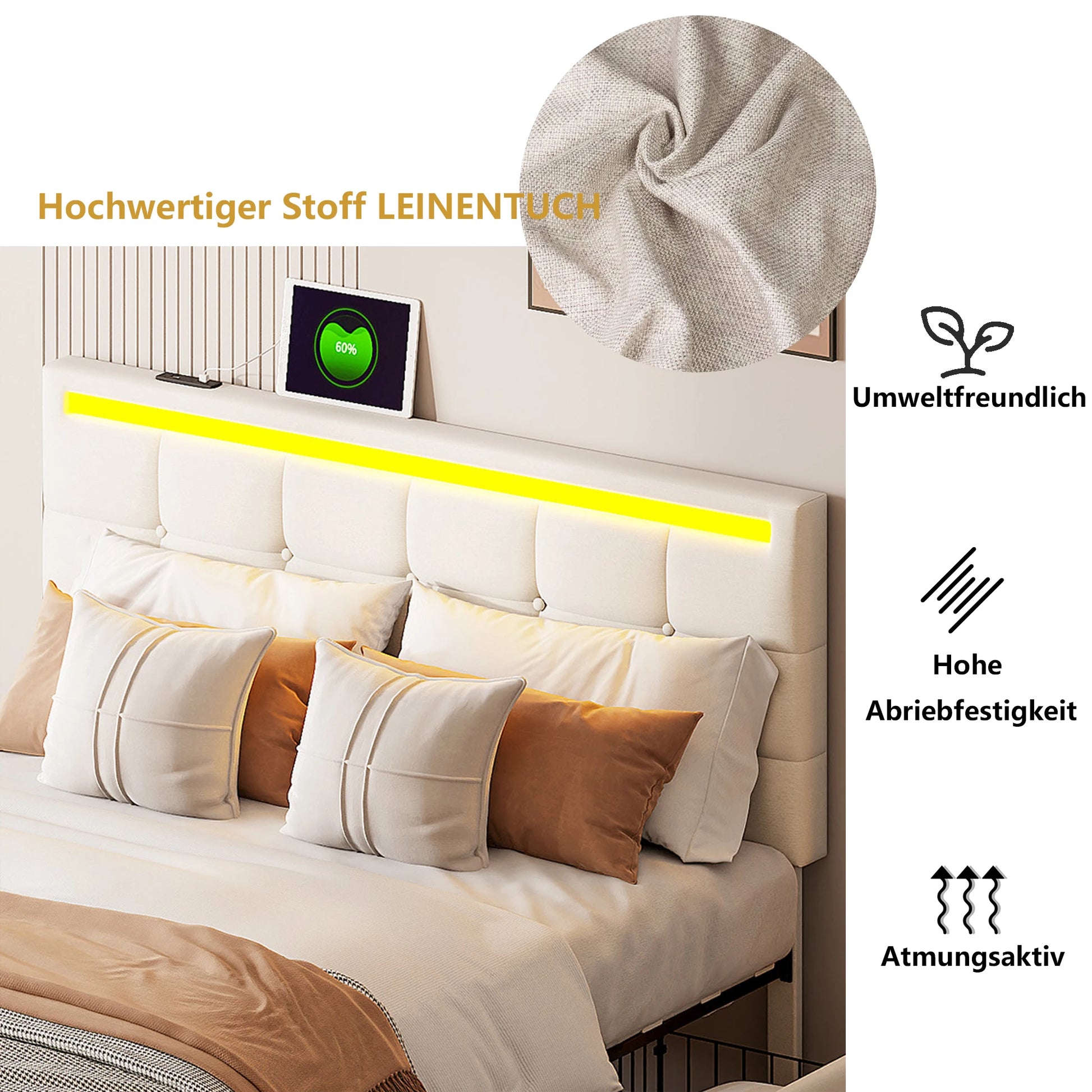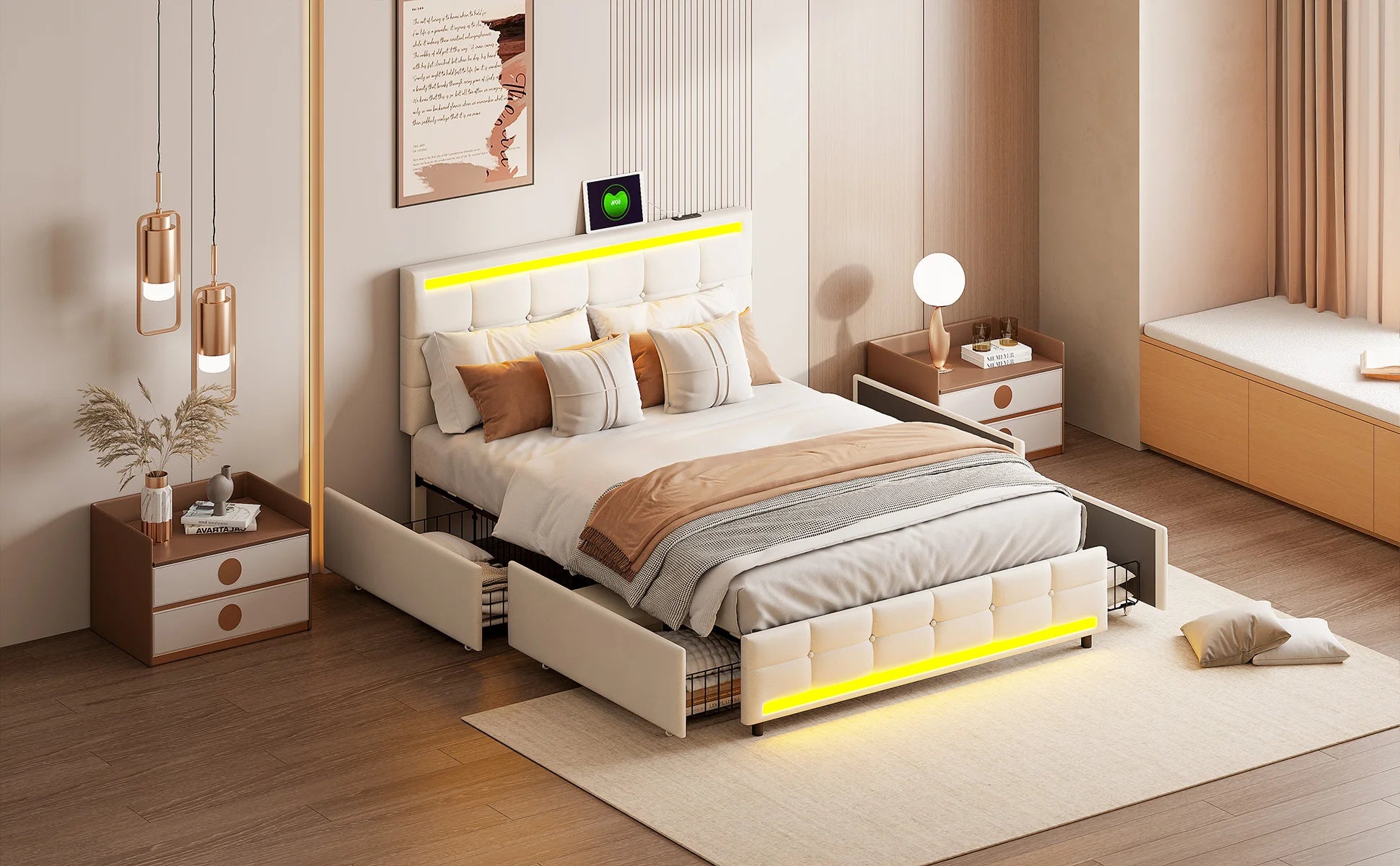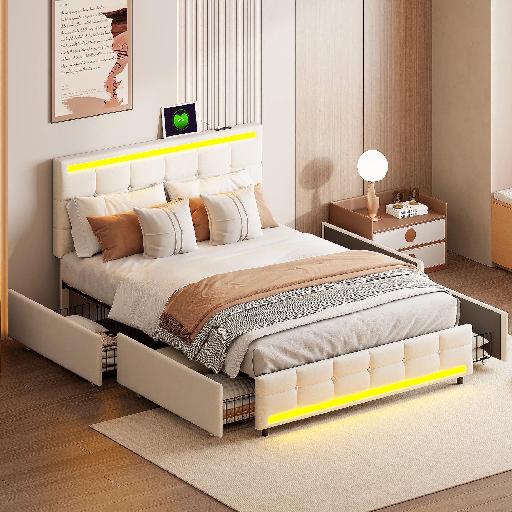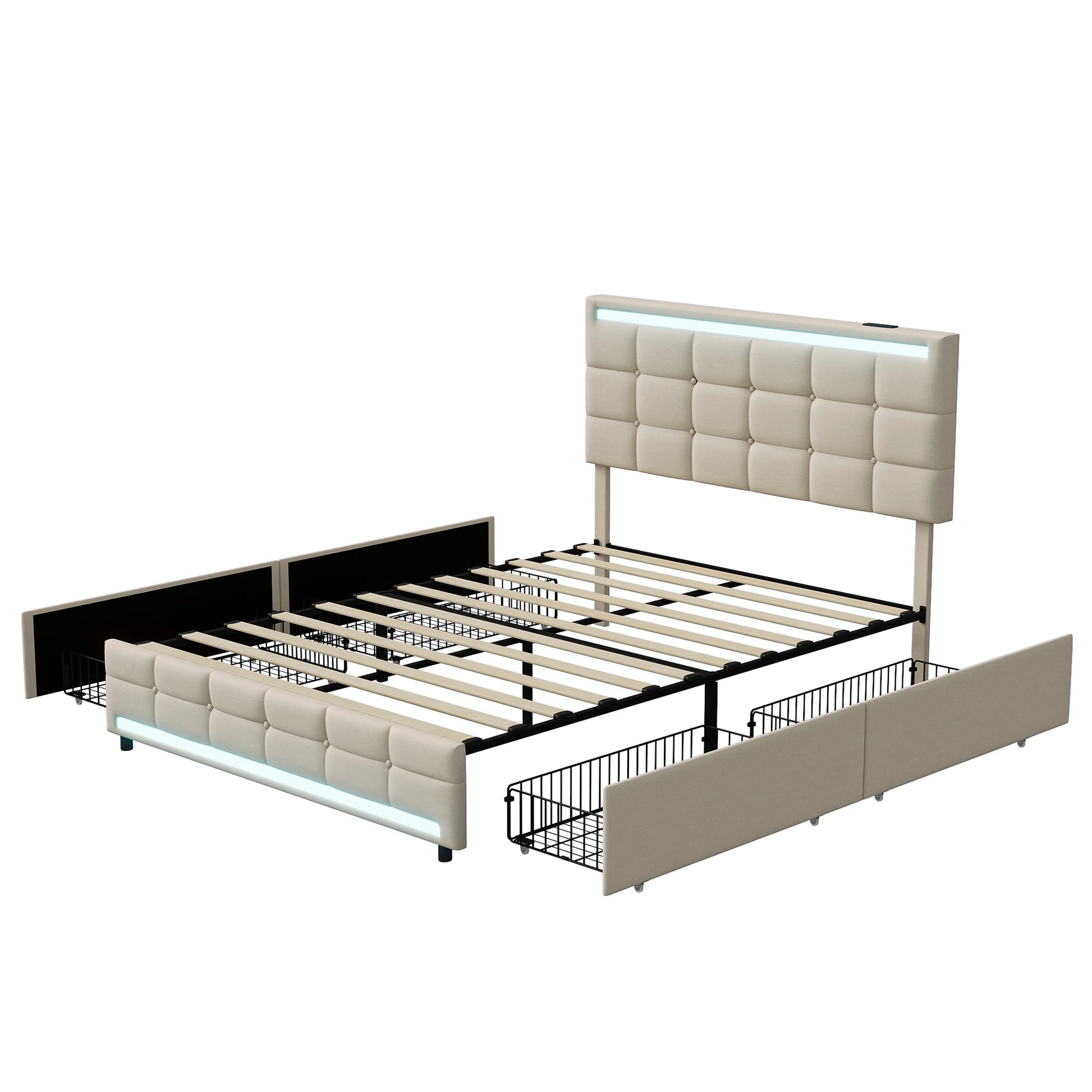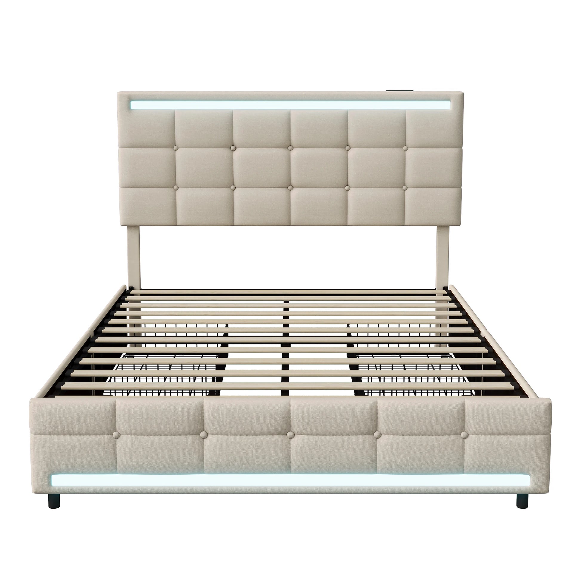 Rosahqnda Polsterbett mit 4 Schubladen und 2 USB-Anschlüssen, Bettrahmen mit LED-Leuchten, Kopfteil, Fußteil und Stauraum