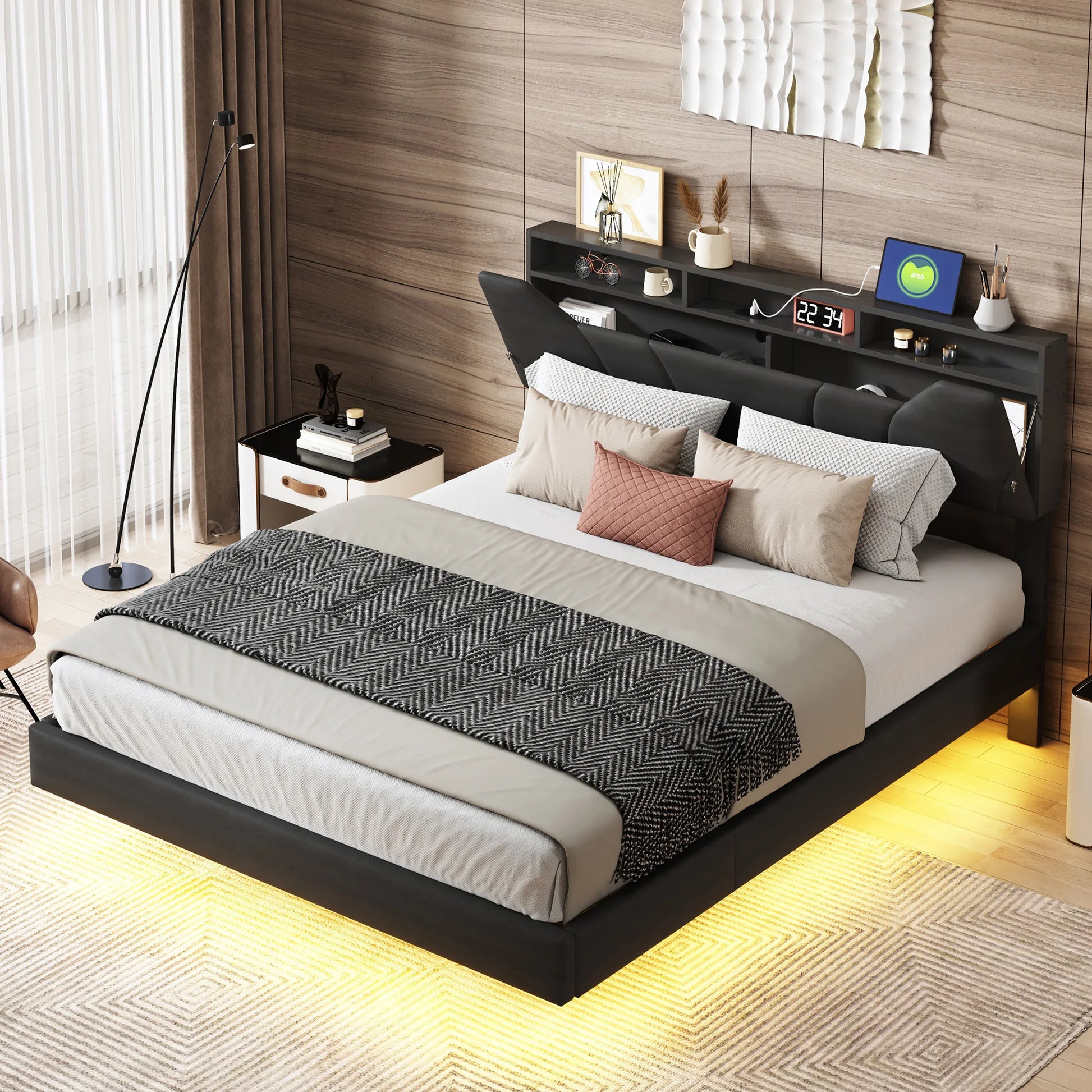 Rosahqnda Soft Bed,Air Pressure Storage Bed, with LED and USB Charging Ports,Adjustable Headboard,Bedroom,Adults,Youth,Black PU