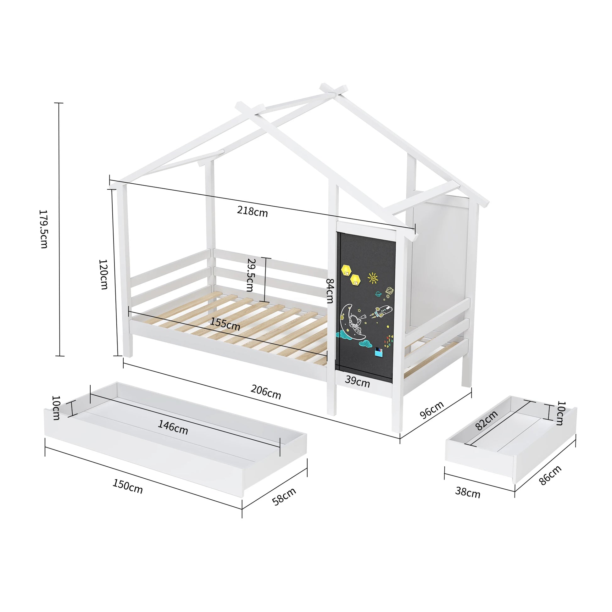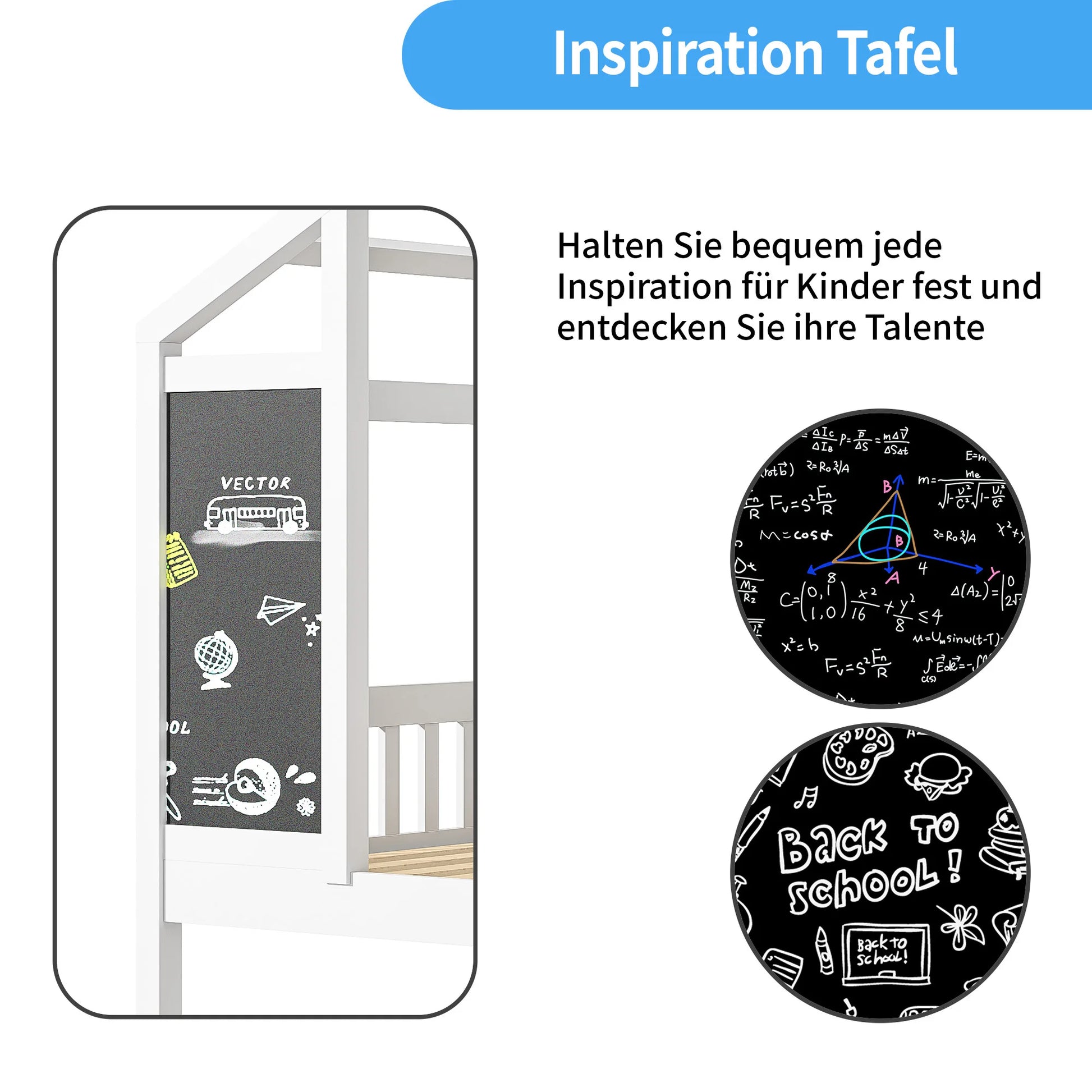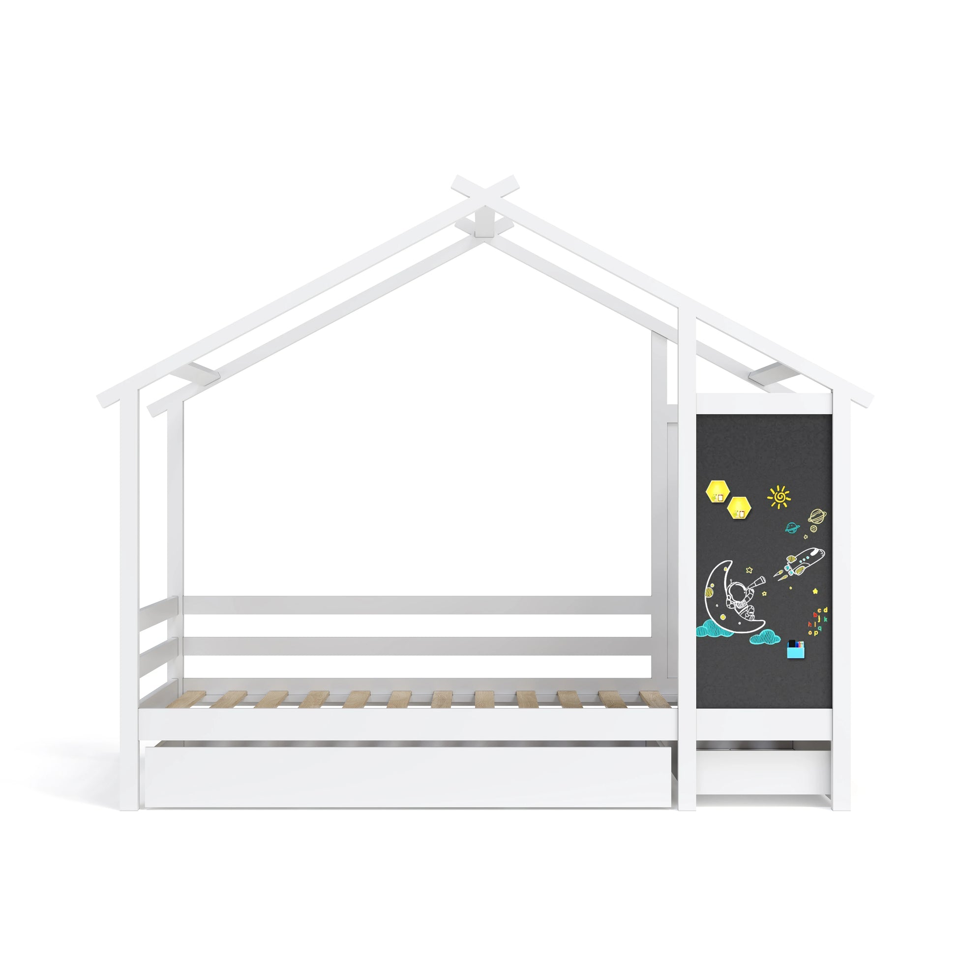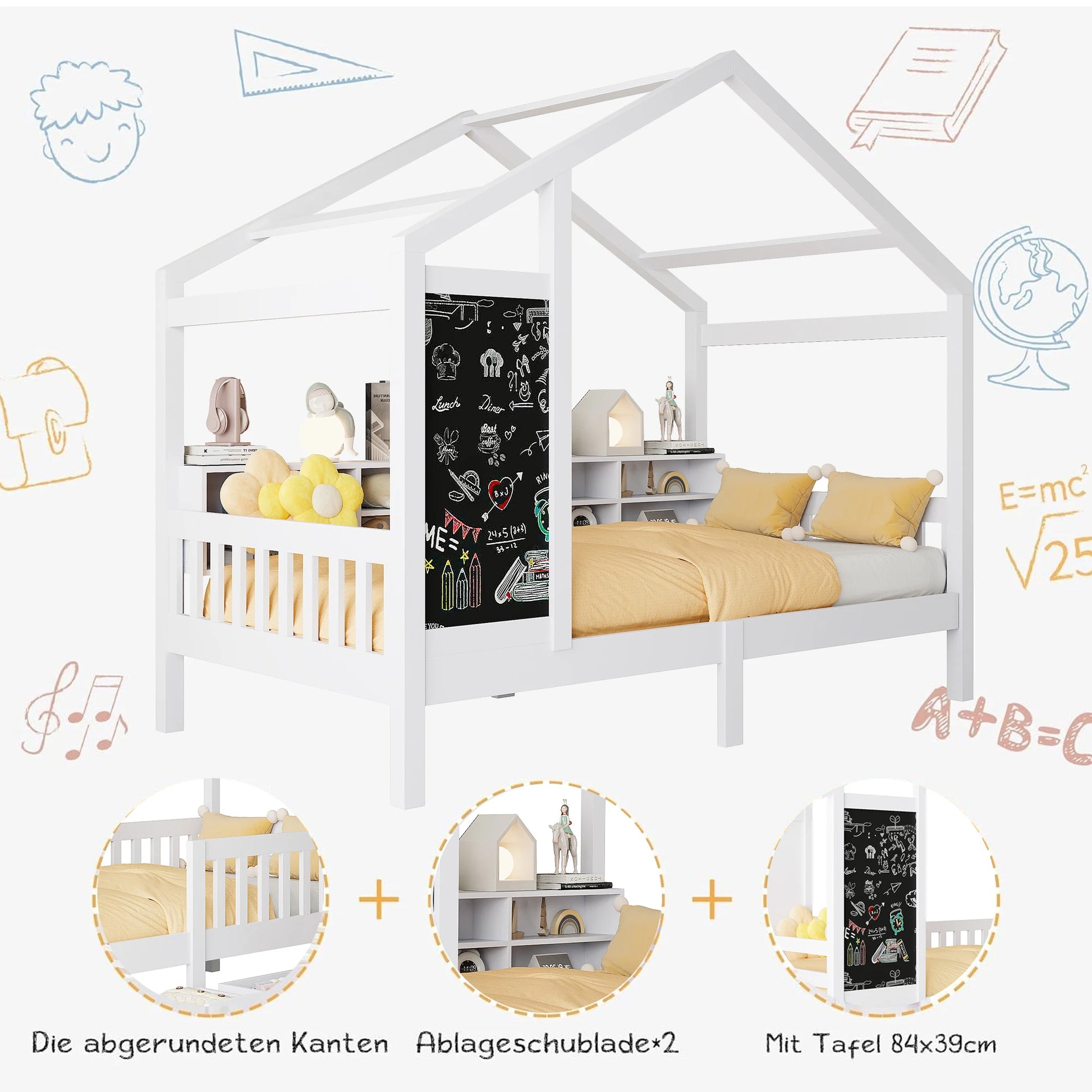 Roshanda Kinderbett, 90 x 200 cm, Hausbett, Einzelbett, mit Tafel/Bücherregal/Schublade, Kiefer, Weiß