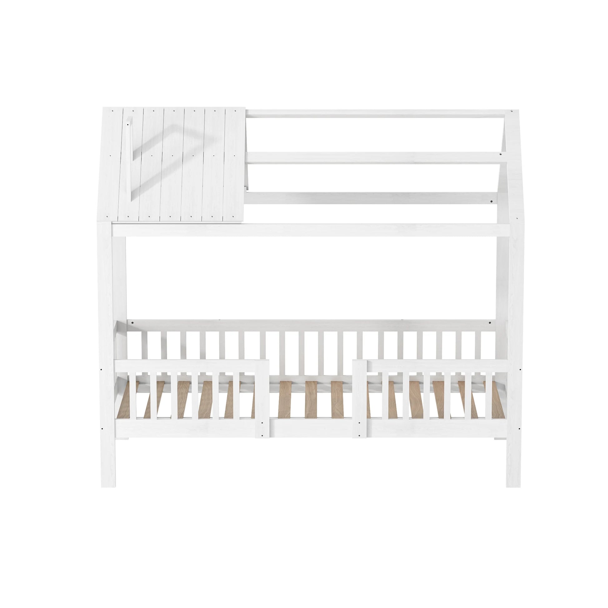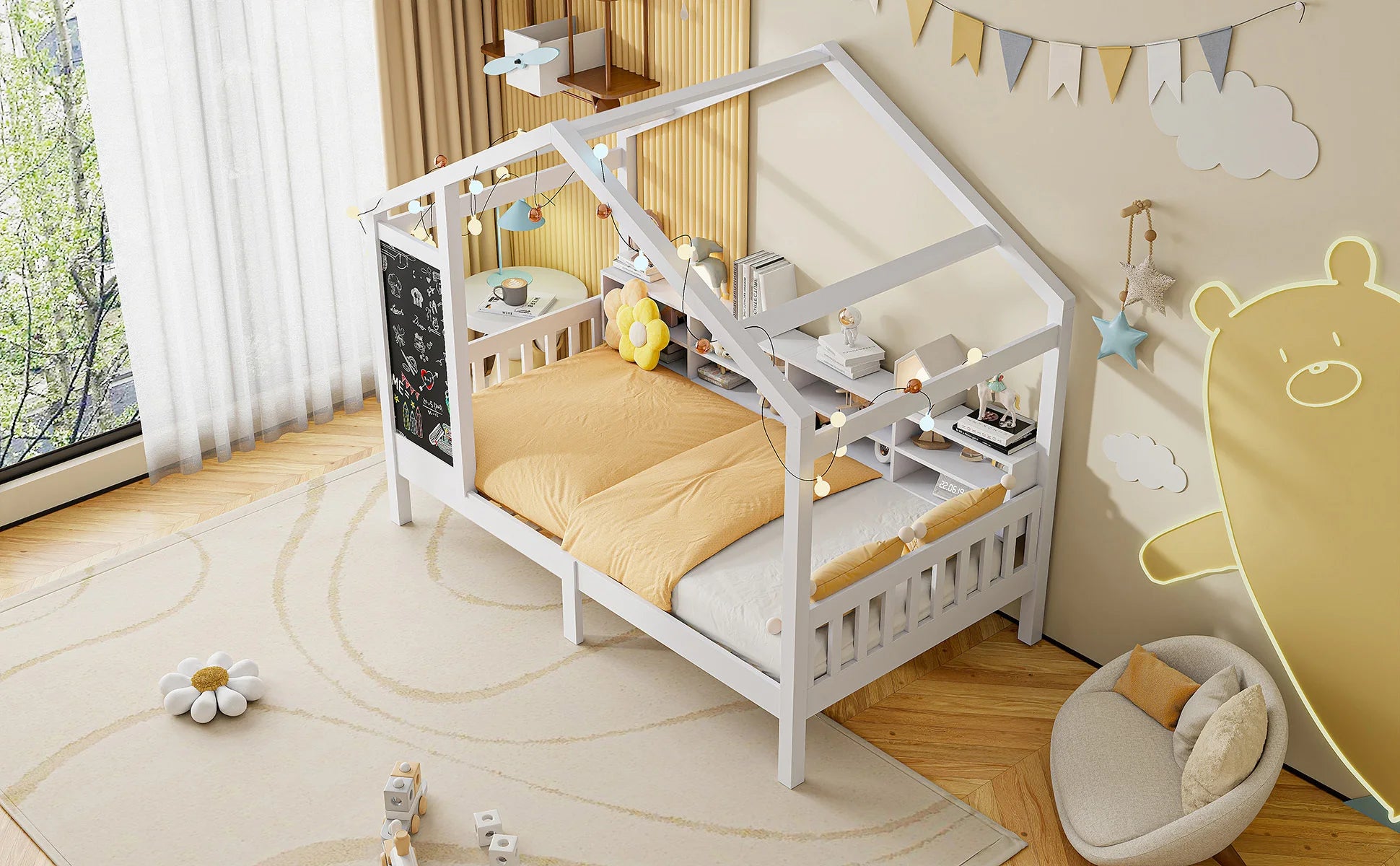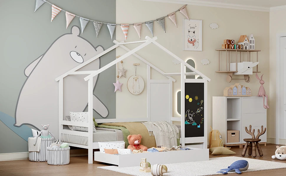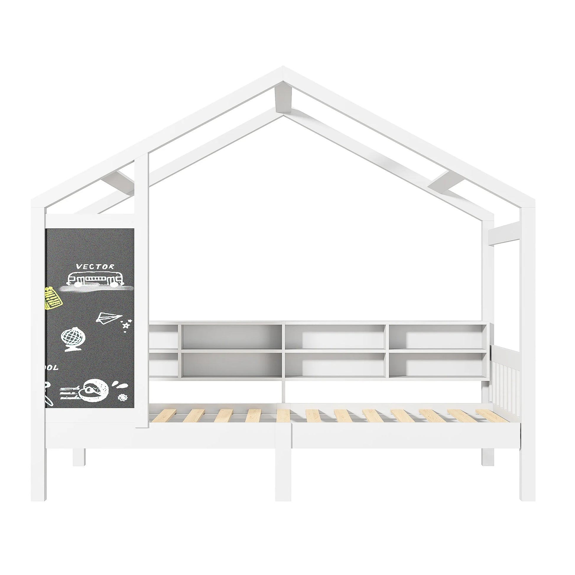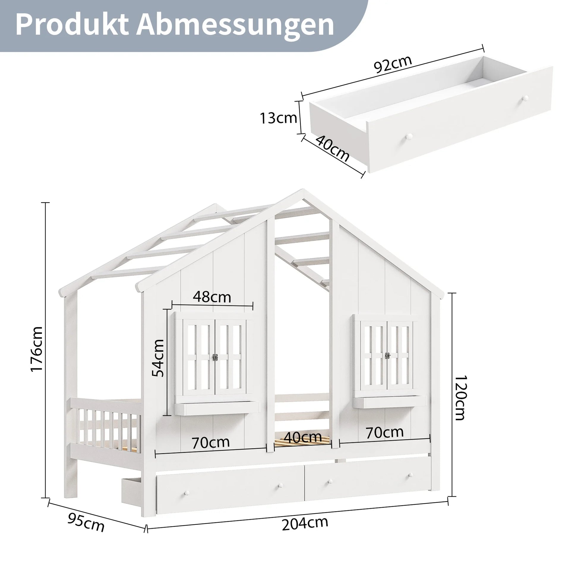 Roshanda Kinderbett, 90 x 200 cm, Hausbett, Einzelbett, mit Tafel/Bücherregal/Schublade, Kiefer, Weiß
