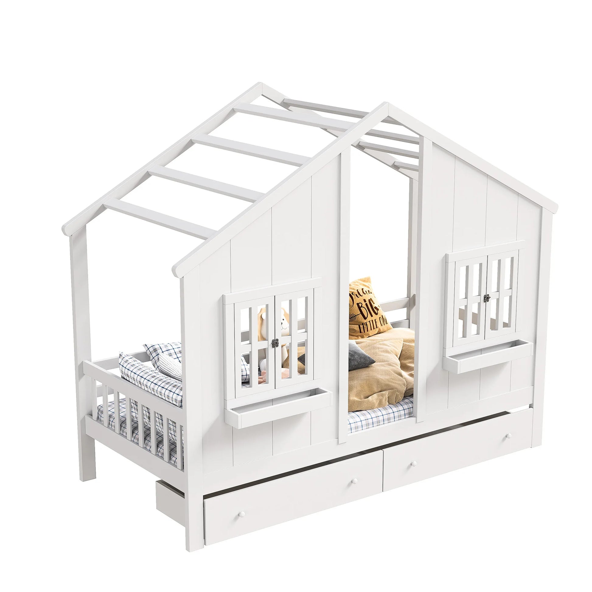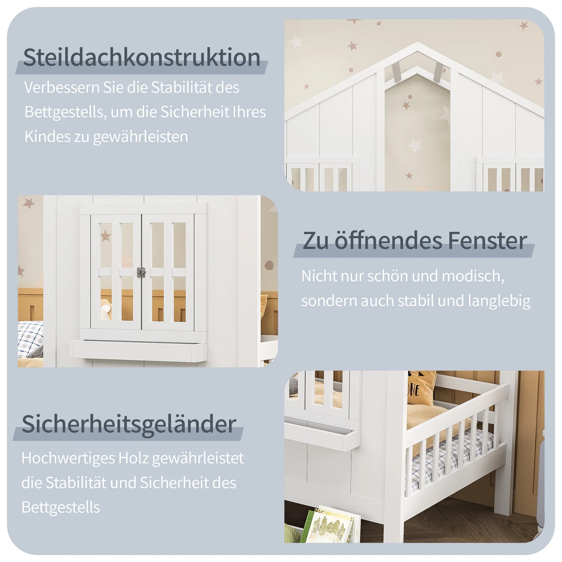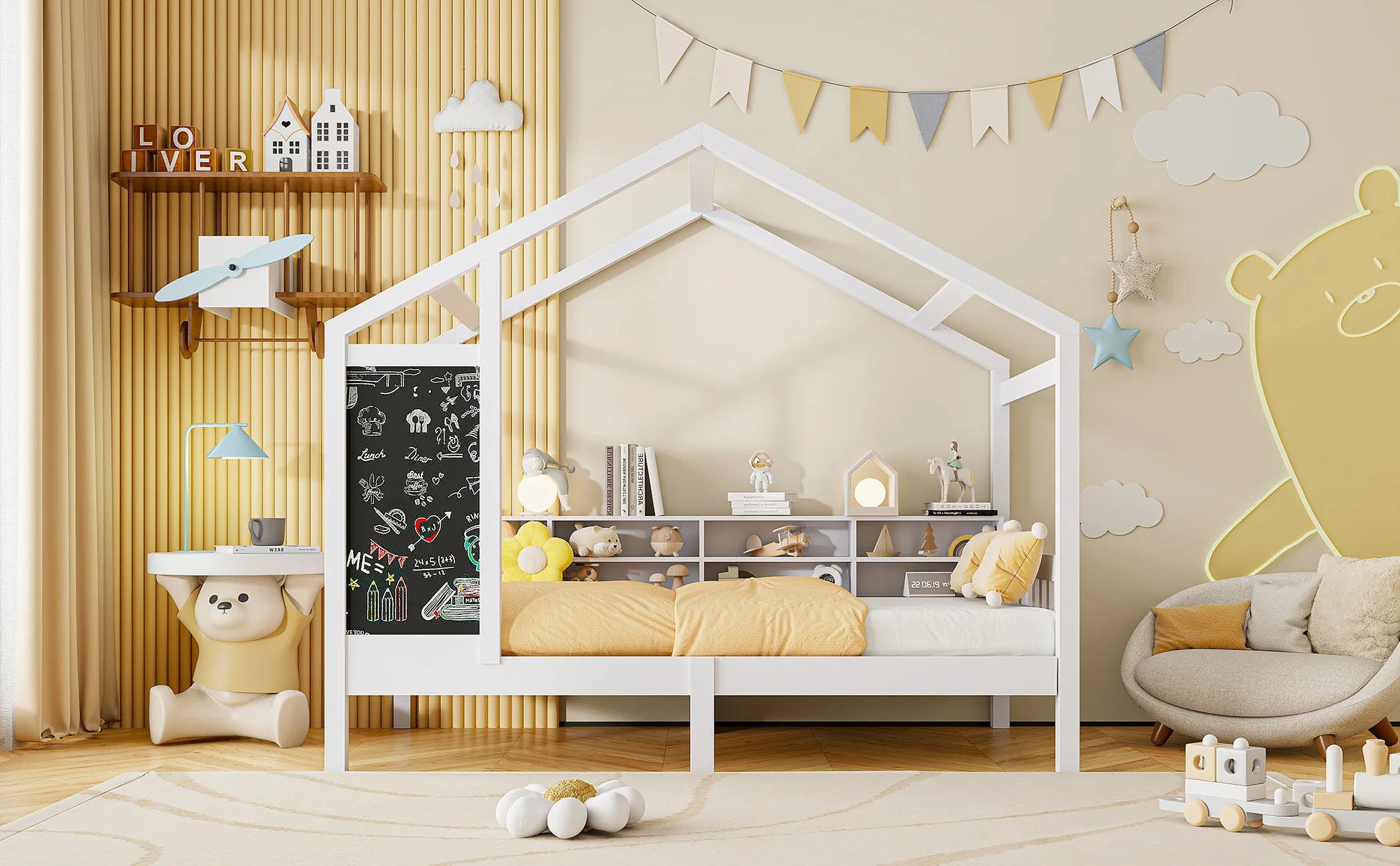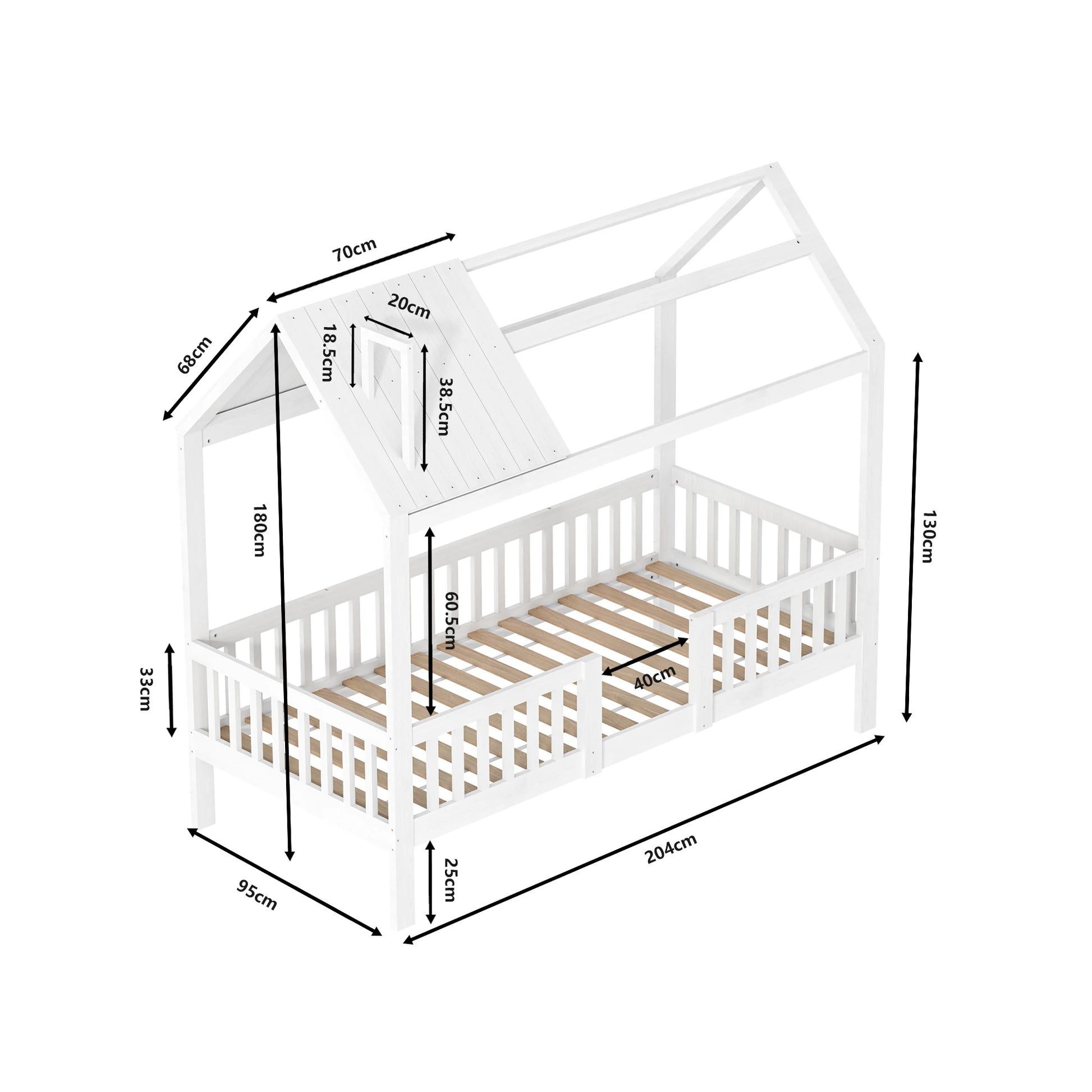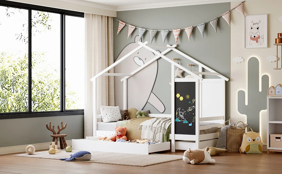Roshanda Kinderbett, 90 x 200 cm, Hausbett, Einzelbett, mit Tafel/Bücherregal/Schublade, Kiefer, Weiß