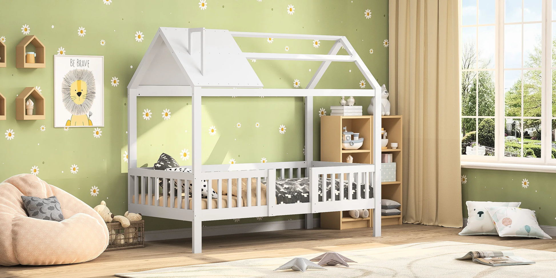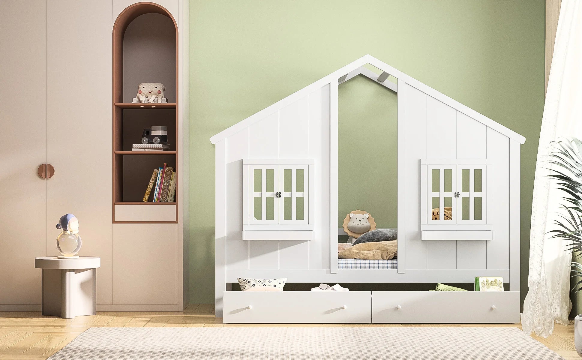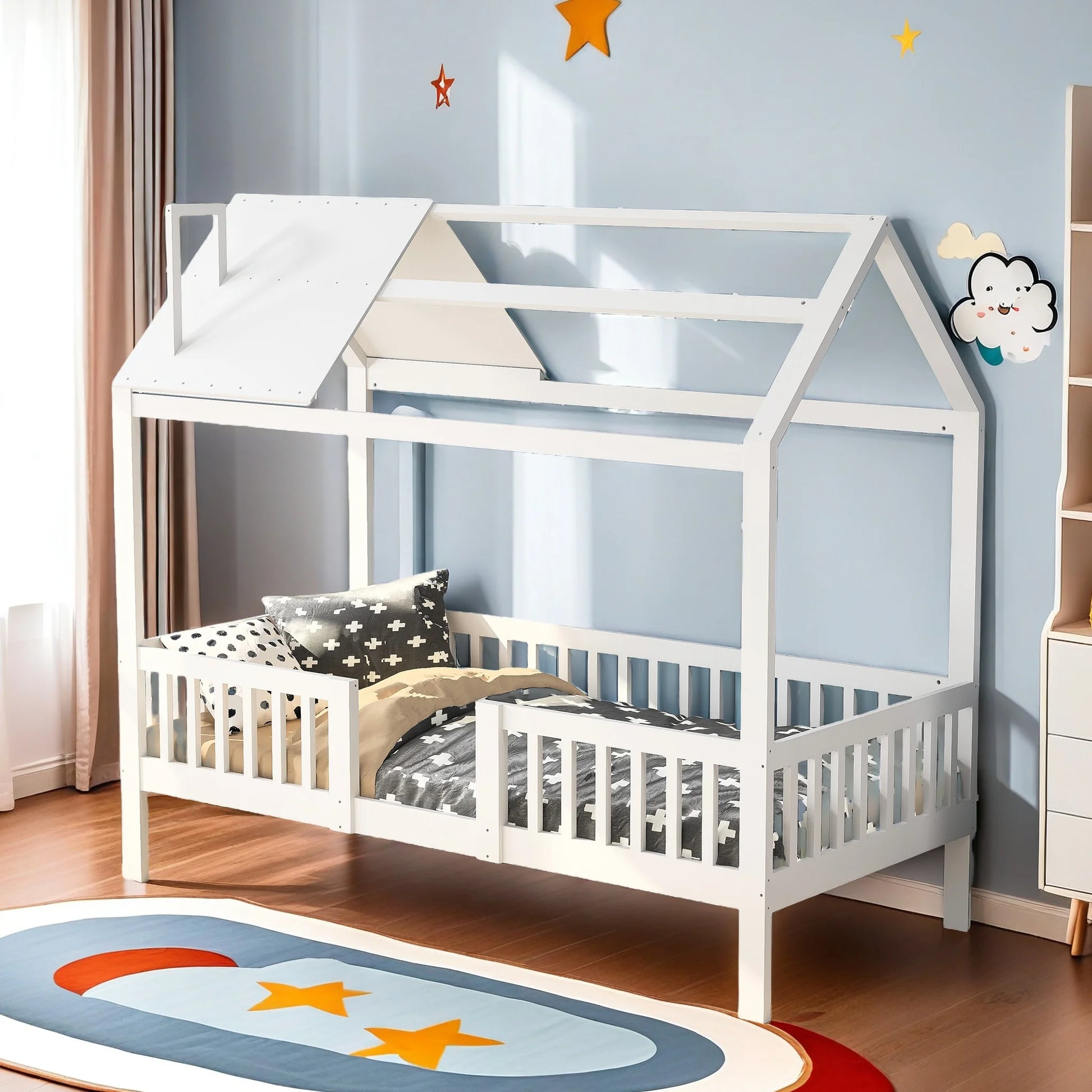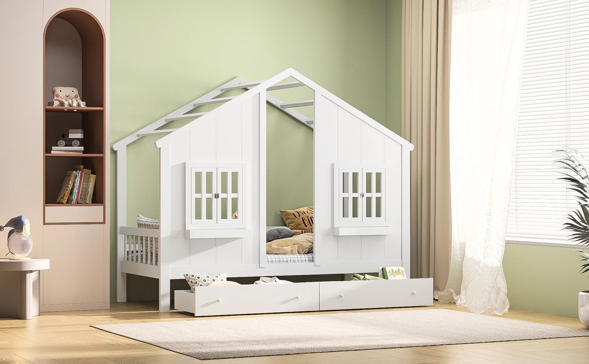 Roshanda Kinderbett, 90 x 200 cm, Hausbett, Einzelbett, mit Tafel/Bücherregal/Schublade, Kiefer, Weiß