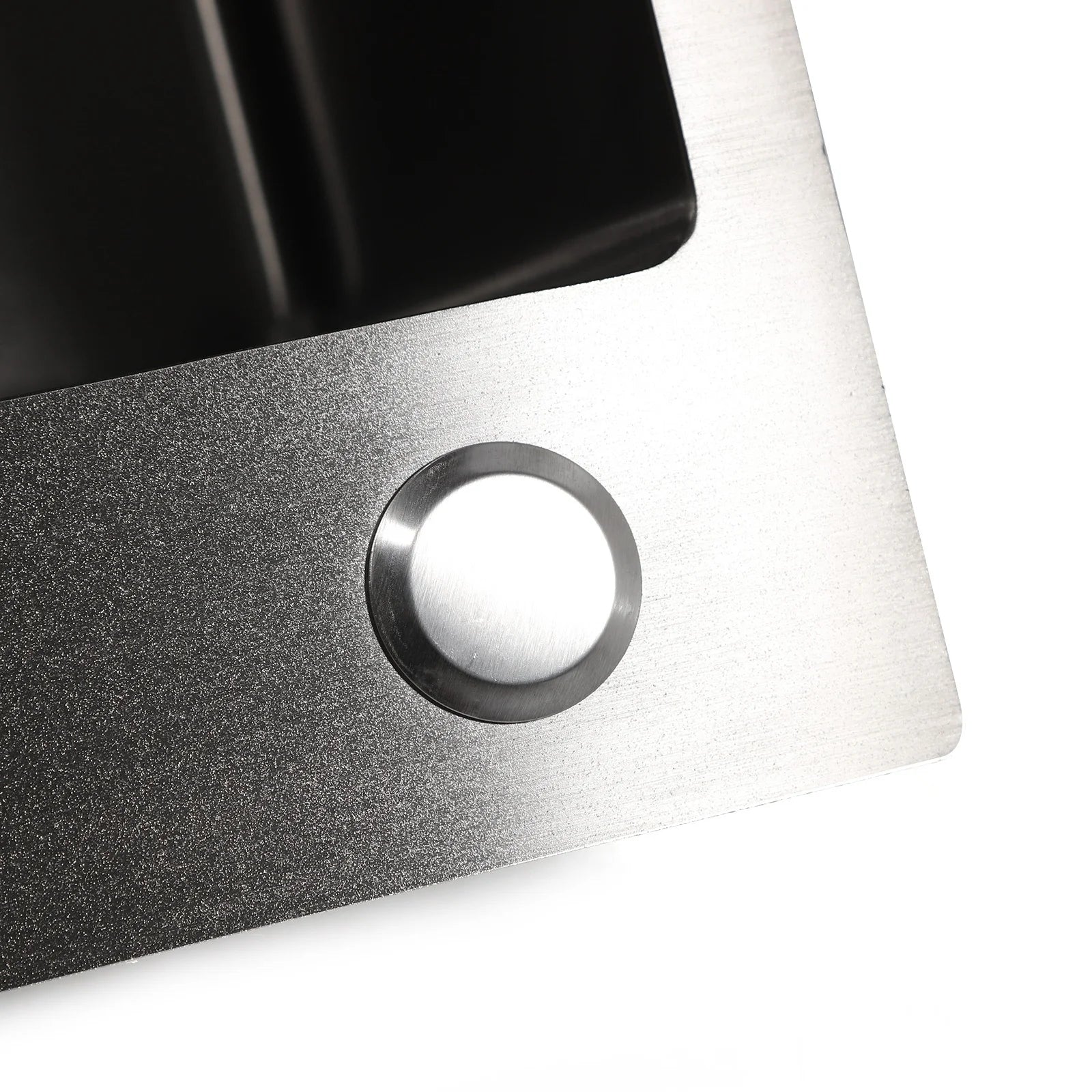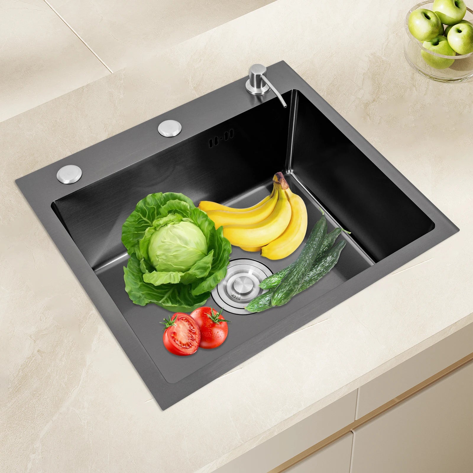 Schwarze Spüle, integrierte Spüle aus Edelstahl, Küchenspüle, Spüle mit Seifenspender und Wasserschlauch, 45 x 50 cm