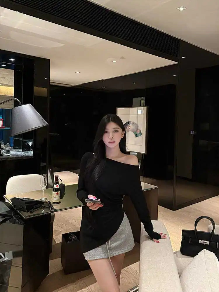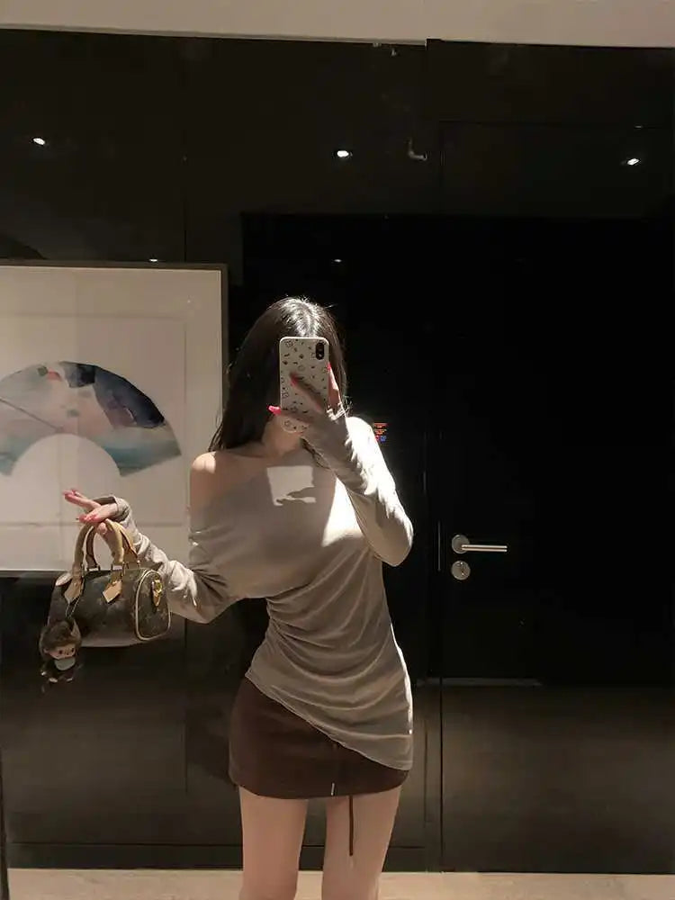 Sexy Long Sleeve T-Shirt Shoulder Bared Waist Cinched Slim Fit Knitted Cotton Solid Color Casual Urban Style for Early Autumn