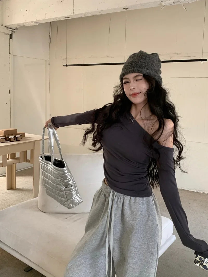SexySpicy Girl Style Blackoff-the-Shoulder Long Sleeve T-shirt Slimming Smooths Your Silhouette Nefarious Crossbody Top For Wome