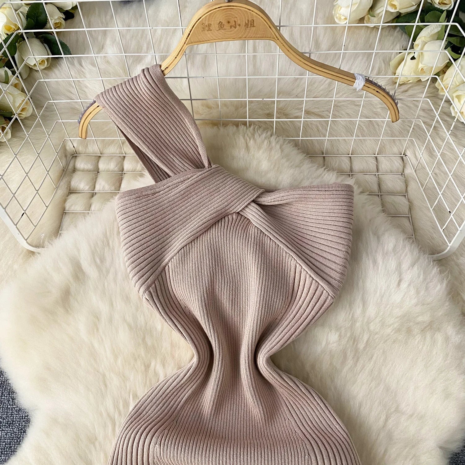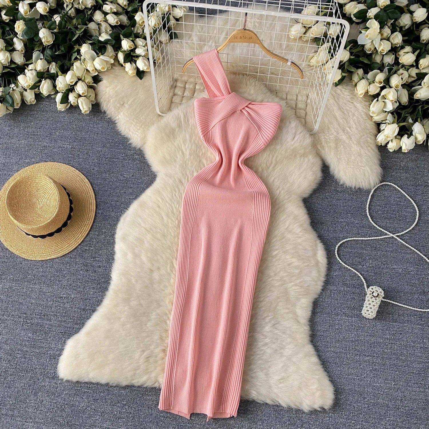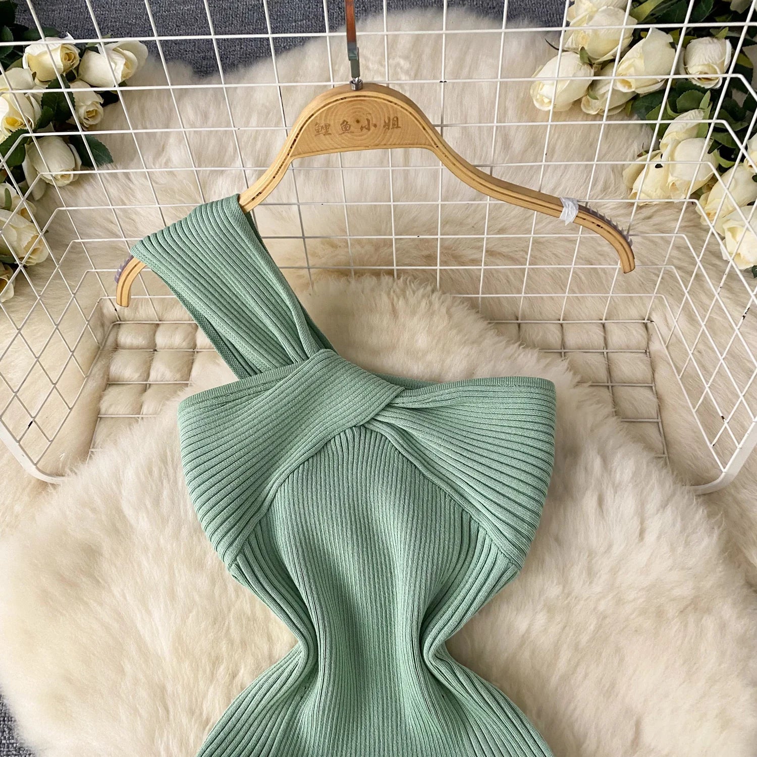 SINGREINY Einzelnen Schulter Tinte Stricken Kleid Backless Tank Gestreiften Schlank Bodycon Sommerkleid Frauen Sommer Beachwear Sexy Chic Vestidos