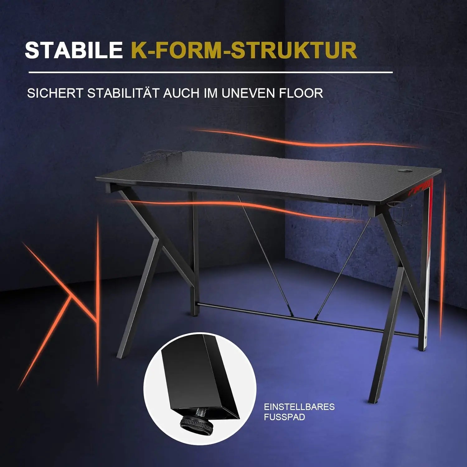 Spieltisch k-förmiger Computer tisch PC-Tisch Schreibtisch mit Getränke halter, Kopfhörer haken und Video regal 115x73 cm
