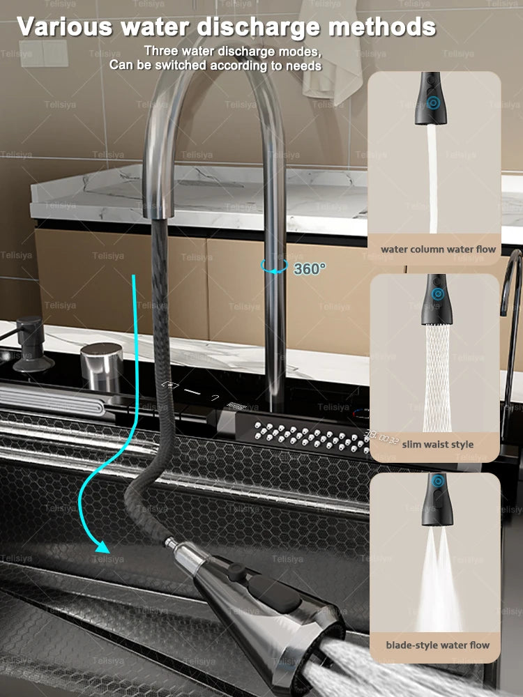 Stainless Steel Kitchen Sink Multifunctional Digital Display Dishwash Sinks Waterfall Large Single Slot Wash Vegetables Basin