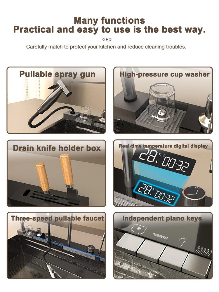 Stainless Steel Kitchen Sink with Waterfall Extra Large Single Slot Digital Display Dishwashing Basin Includes Sinks 100x50cm
