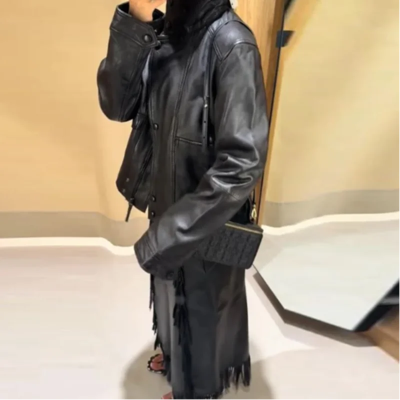 Street PU Leather Loose Jacket Women Fashion Solid Full Sleeve Stand Collar Single Breasted Coats Female 2025 Autumn Lady Coat