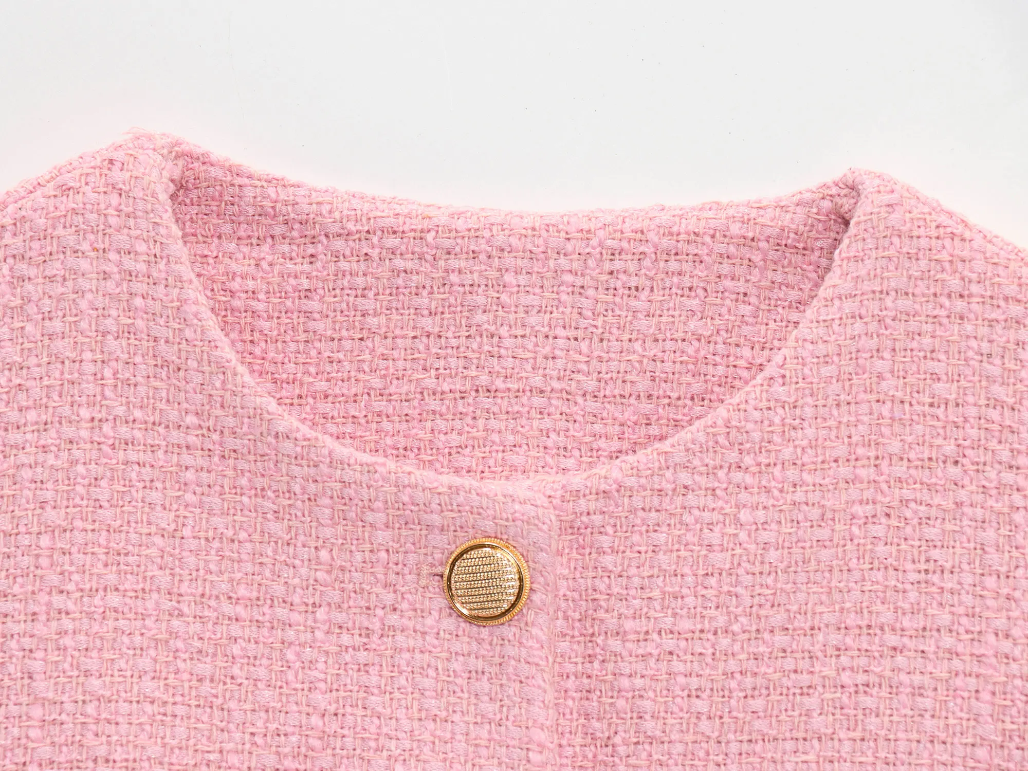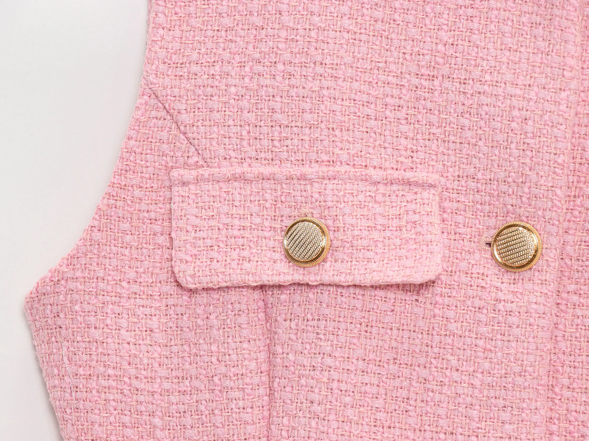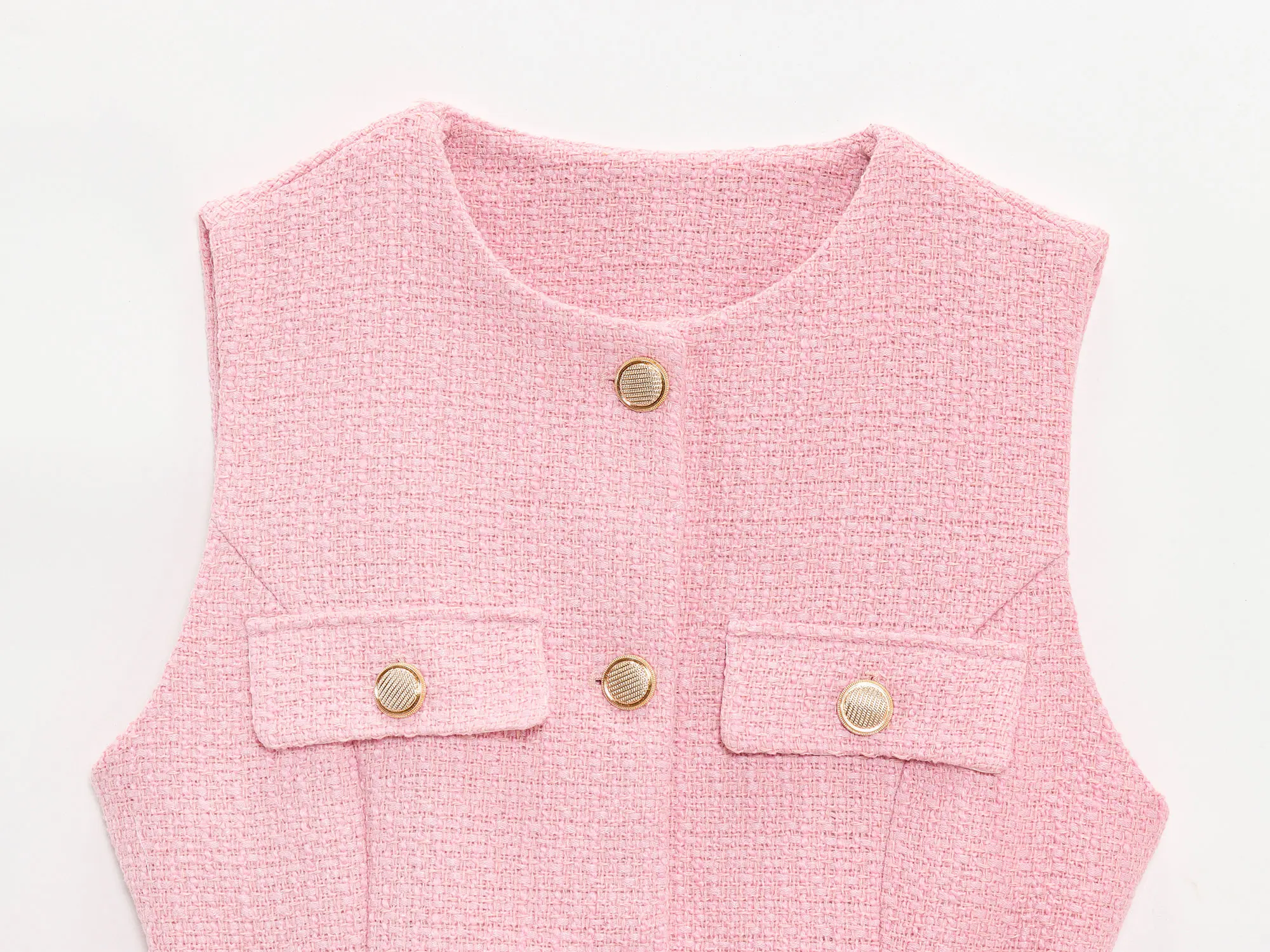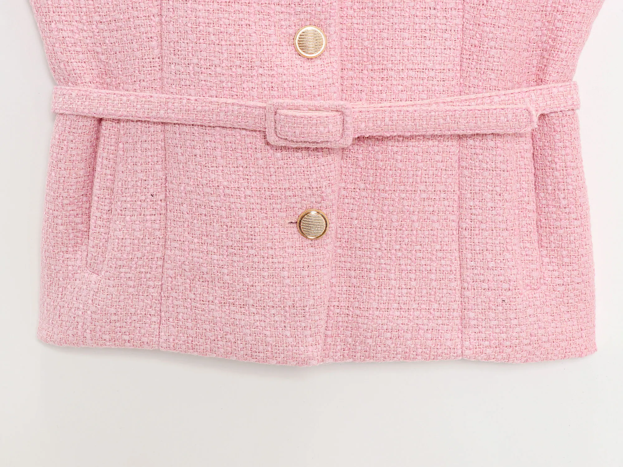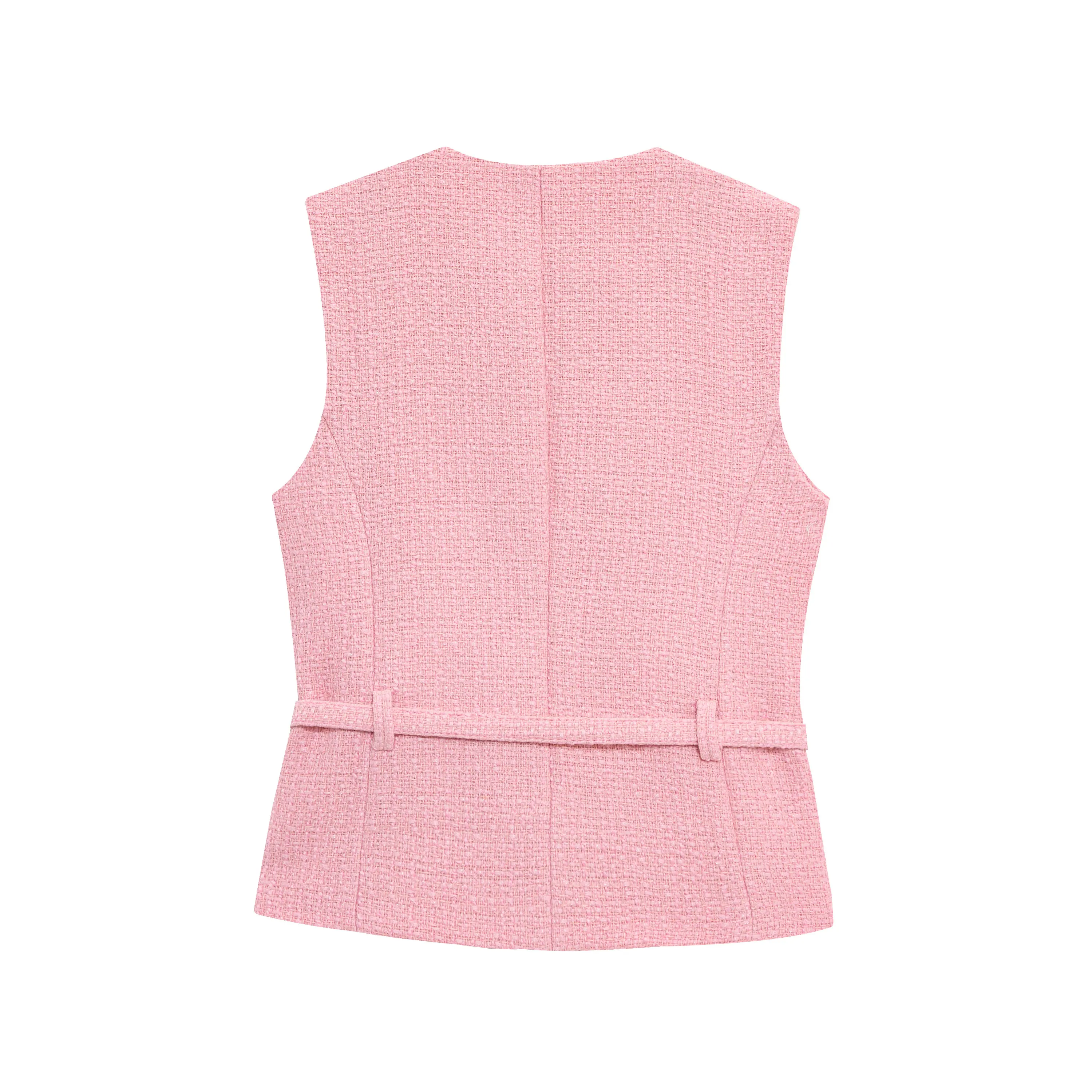 TRAFZA Frauen Elegante Solide Gürtel Westen Tops O Neck Metall Taste Ärmellose Weste Büro Dame Oberbekleidung Casual Blazer Tops