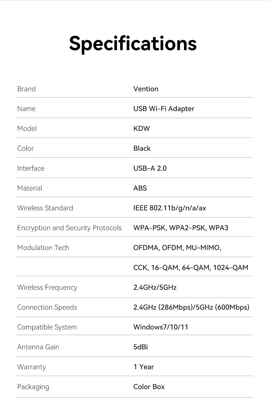 Vention New USB WiFi 6 Adapter 5G/2.4G 600Mbps Wireless WiFi Receiver Antenna Network Card Dongle LAN for Laptop PC Win 10/11