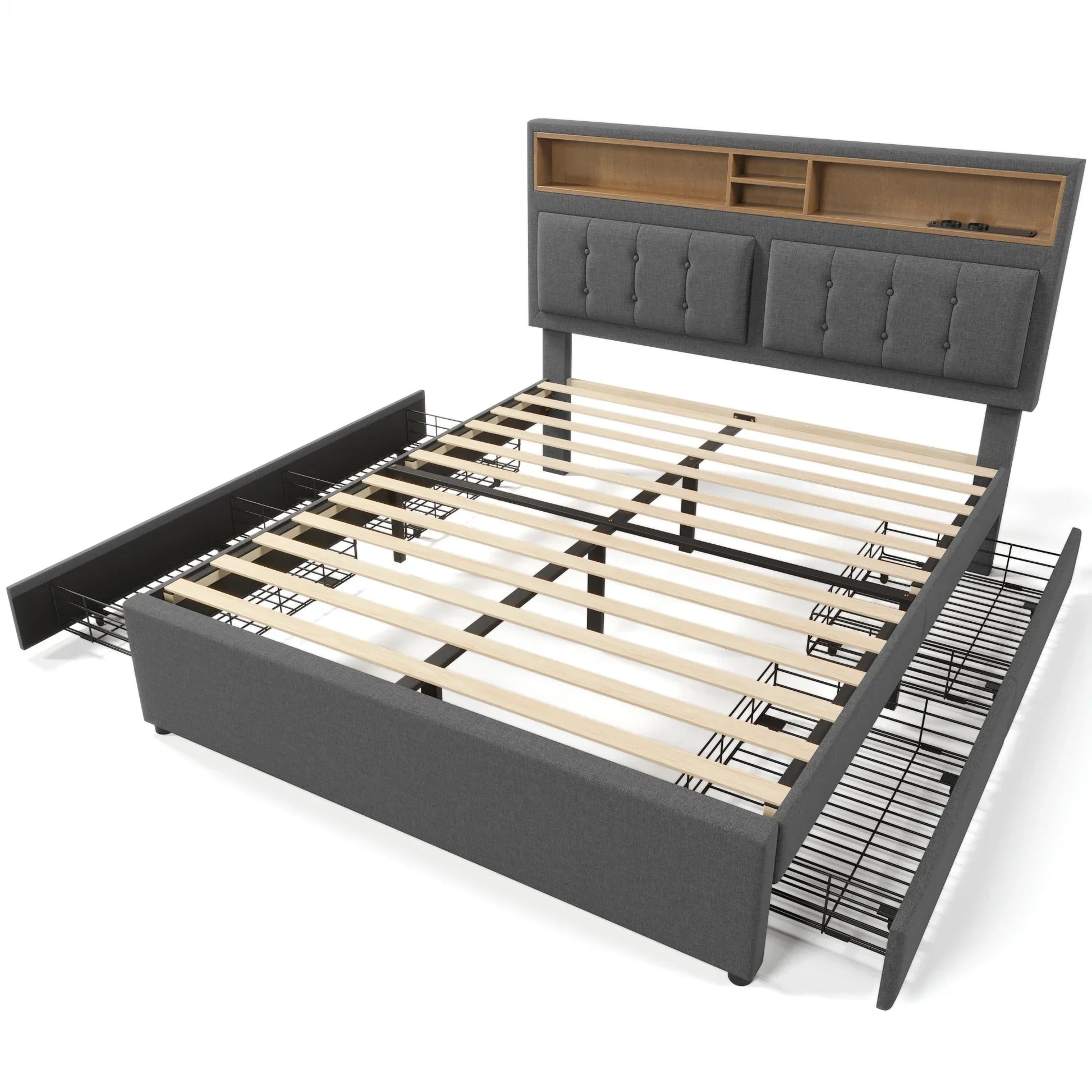 VSOGA 160 x 200 cm großes Doppelbett mit 4 Schubladen und USB-C-Buchse, höhenverstellbarem Kopfteil, Lattenrost aus Holz (mit Matratze)