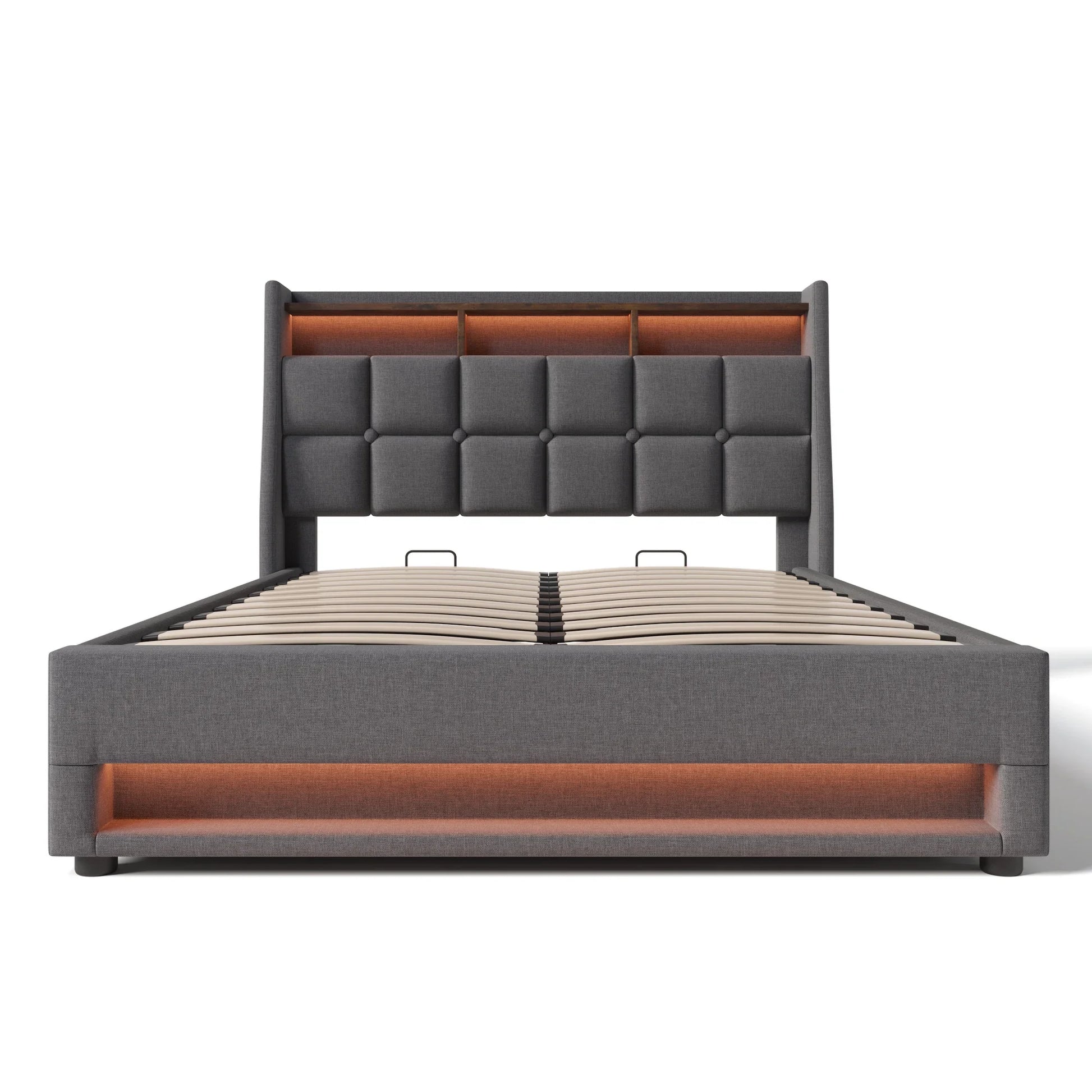 VSOGA Polsterbett mit USB 90/140/160 x200 cm, LED-Doppelbett mit Metallrahmenlatten, Bettrahmen aus Leinen (mit Matratze)