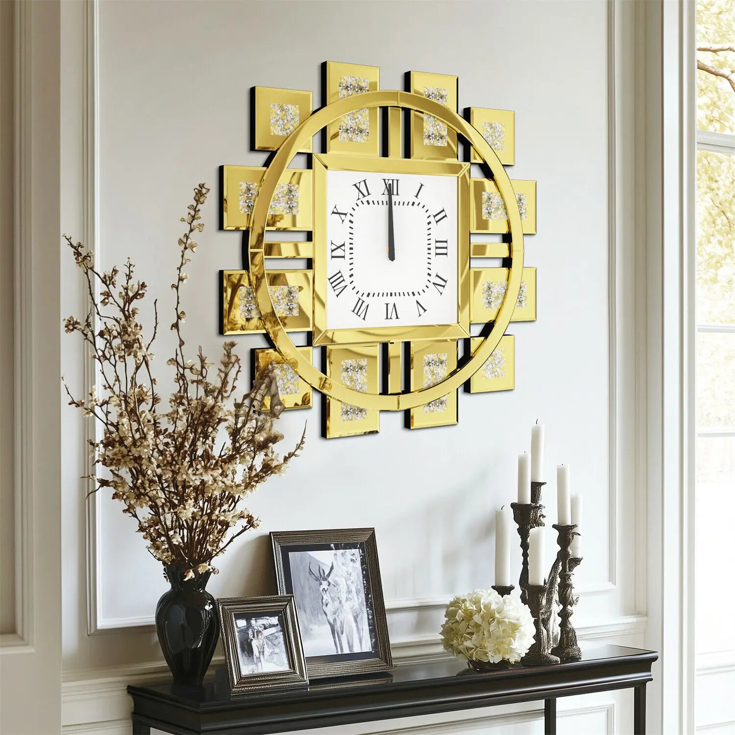 Wanduhr 60 cm/24 Zoll, runde Uhr mit zerkleinertem Diamant-Dekor, abgeschrägter Spiegelkantenrahmen, golden/silber, für Einstieg, Wohnzimmer, Büro