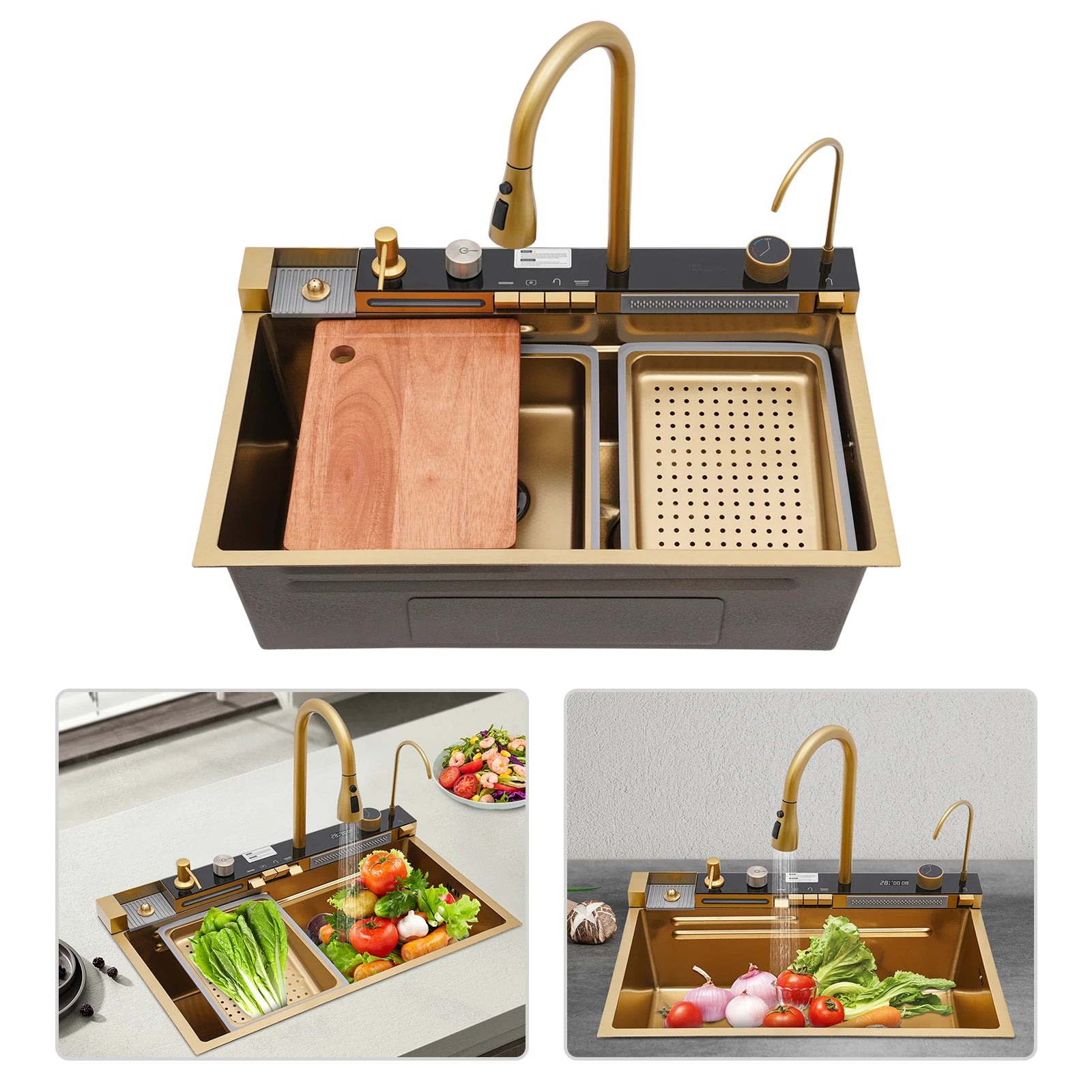 Wasserfall-Küchenspüle aus Edelstahl 304, 75 x 46 cm, multifunktionaler Wasserhahn mit digitalem Bedienfeld