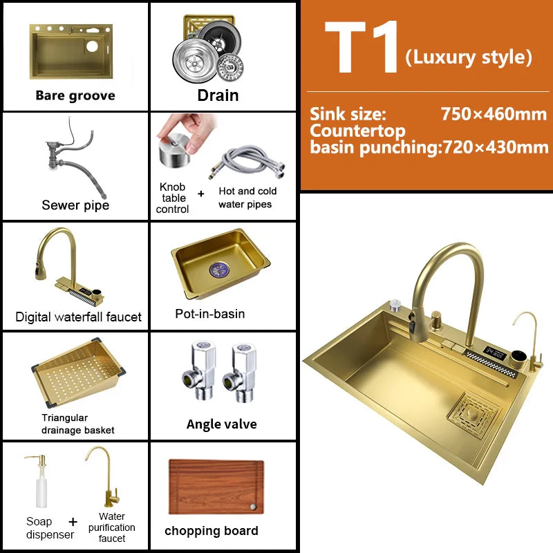 Waterfall Sink Kitchen Stainless Steel Topmount Sink Large Single Slot Wash Basin With Multifunction Touch Waterfall Faucet