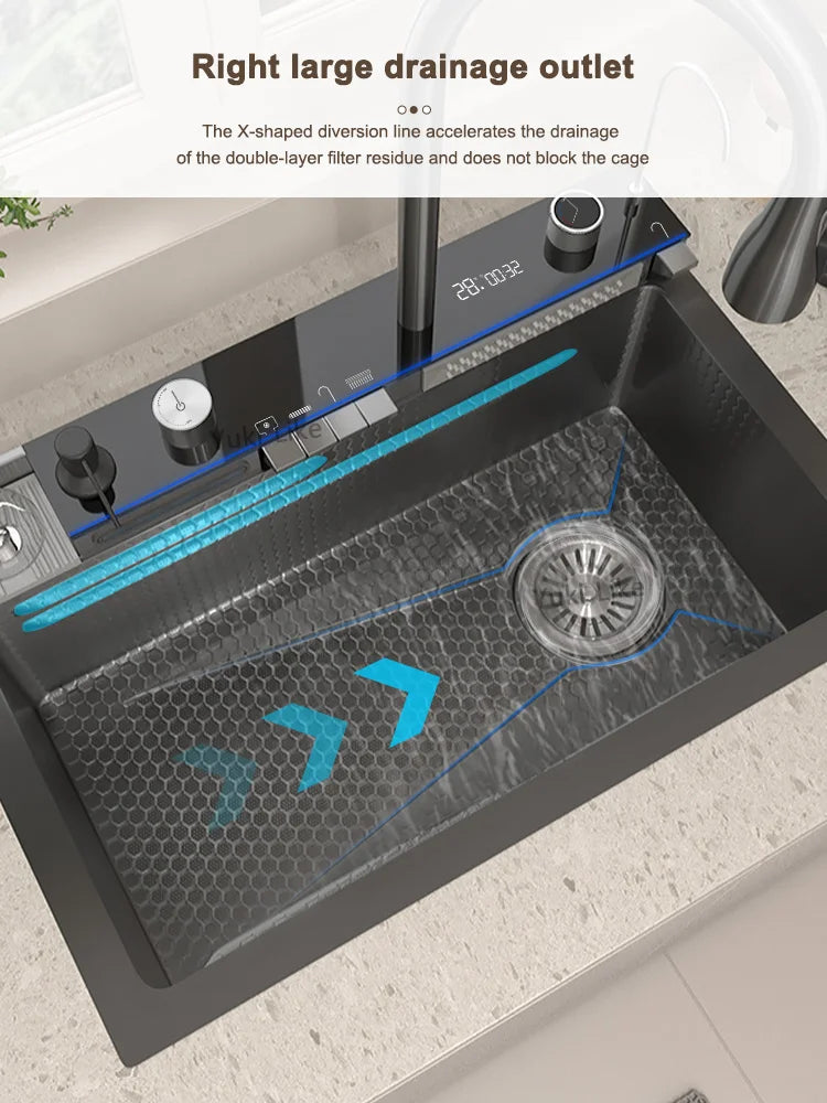 Waterfall Stainless Steel Kitchen Sink Intelligent Digital Display Faucet Large Single Slot Dishwash Bowl Wash Vegetables Basin
