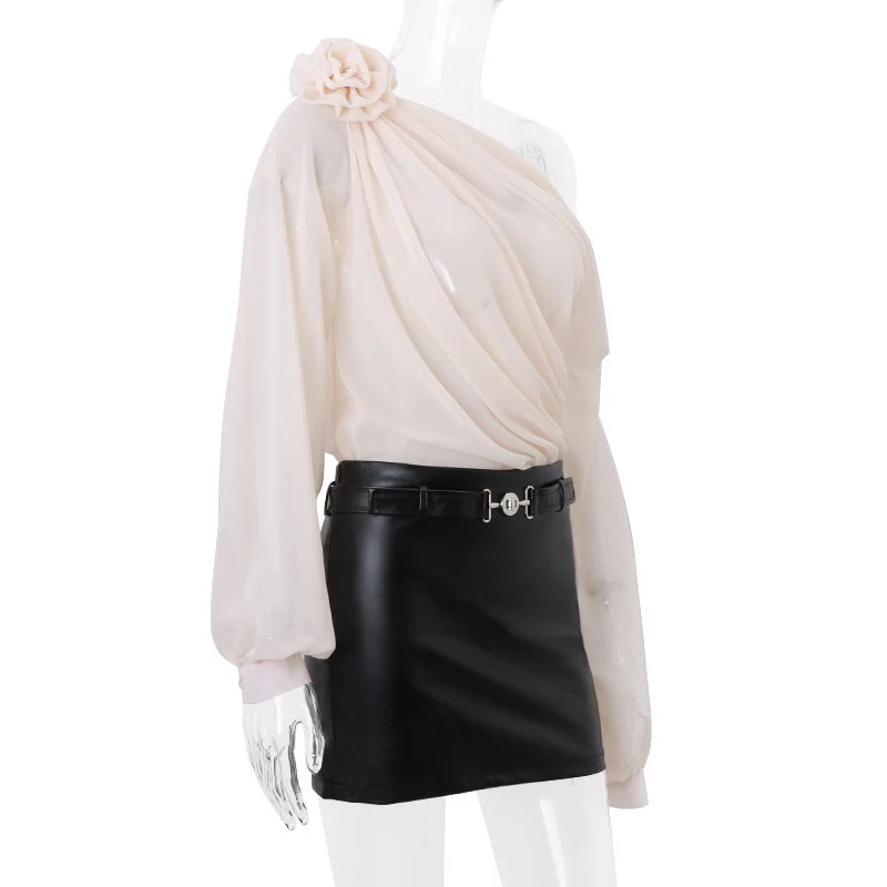 WhereMery Sexy Irregular Oblique-neck Flower Applique T Shirt Summer Off Shoulder Fashion Long Sleeve Crop Tops Street Mesh Tees