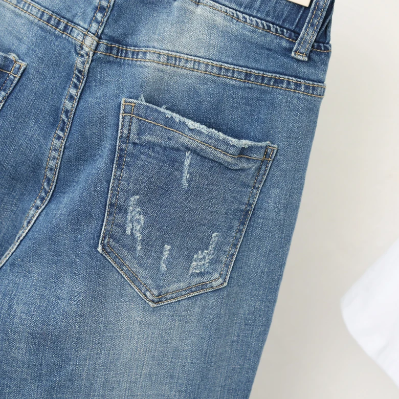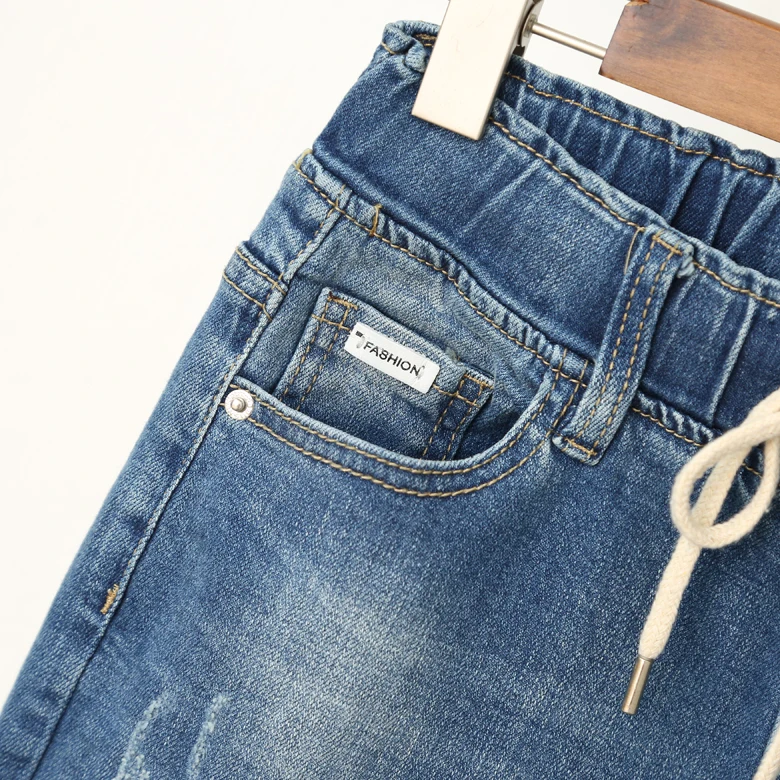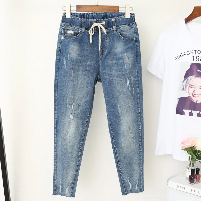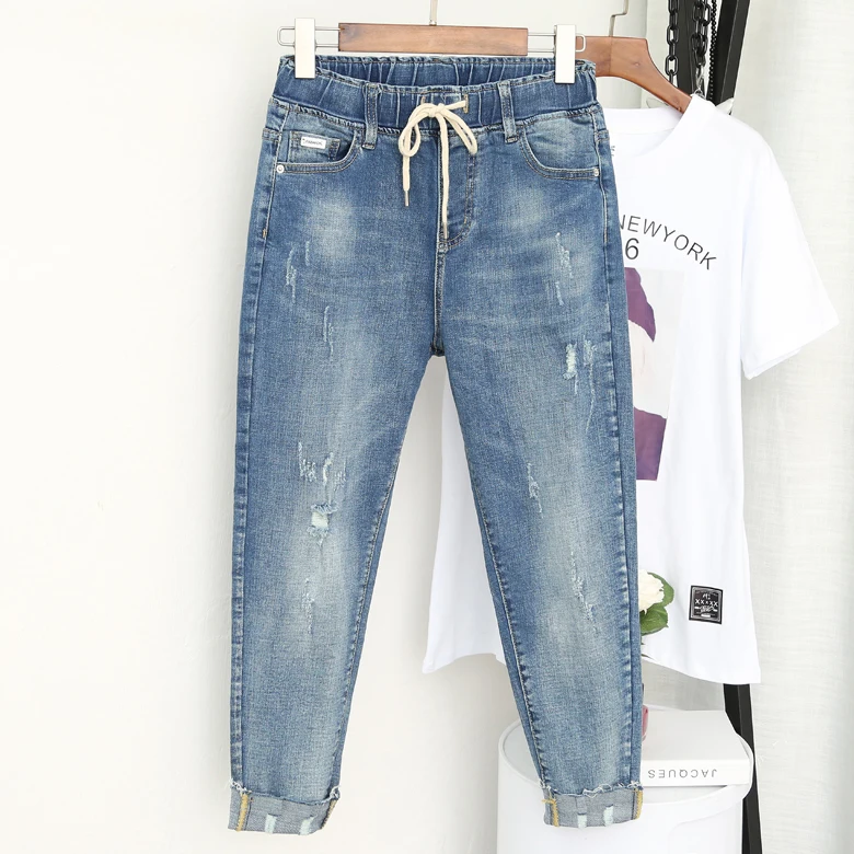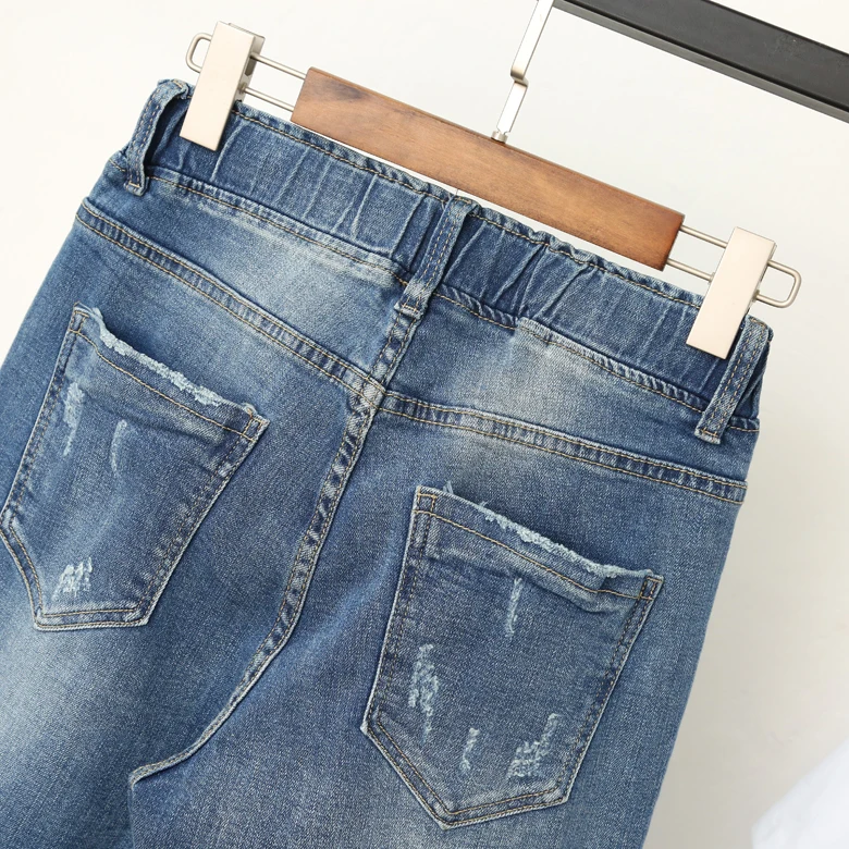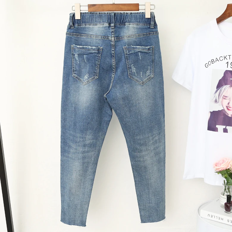 Women Summer Autumn Baggy Elastic Waist Jeans Korea Style Ripped Pants Female 100KG Loose Harem Trousers Cloth