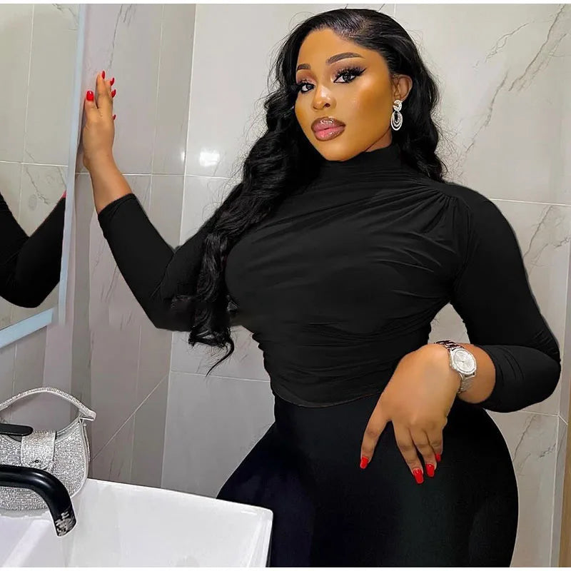 Women Tees Sexy Turtleneck Long Sleeve Pleated All-match Basic Lady T-shirts 2025 Spring Autumn Fashion Chic Female Streetwears