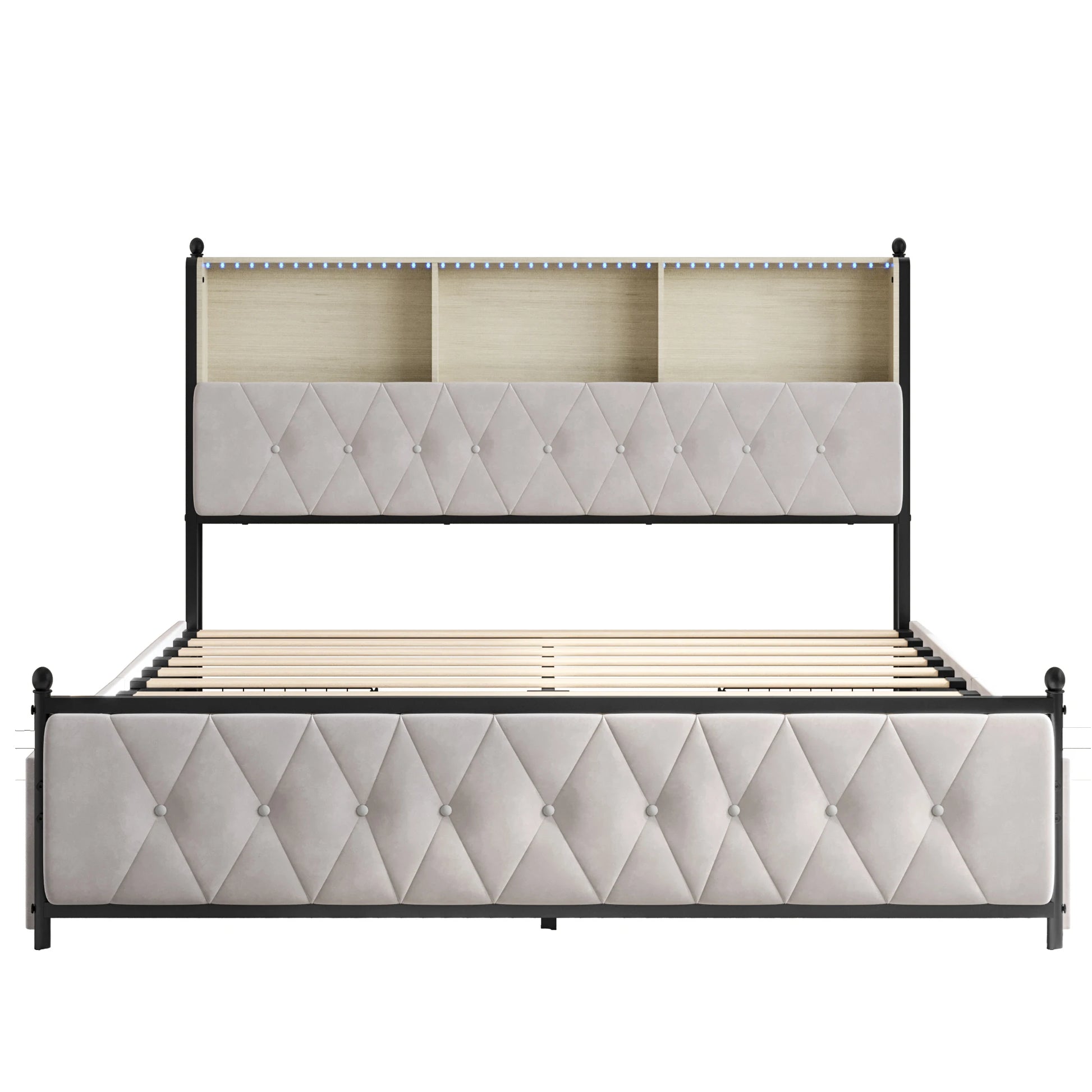 WoodenAura 140x200cm Polsterdoppelbett mit LED-Kopfteil und USB, mit Lattenrost und 4 Schubladen, Stauraum, Funktionsbett180x200