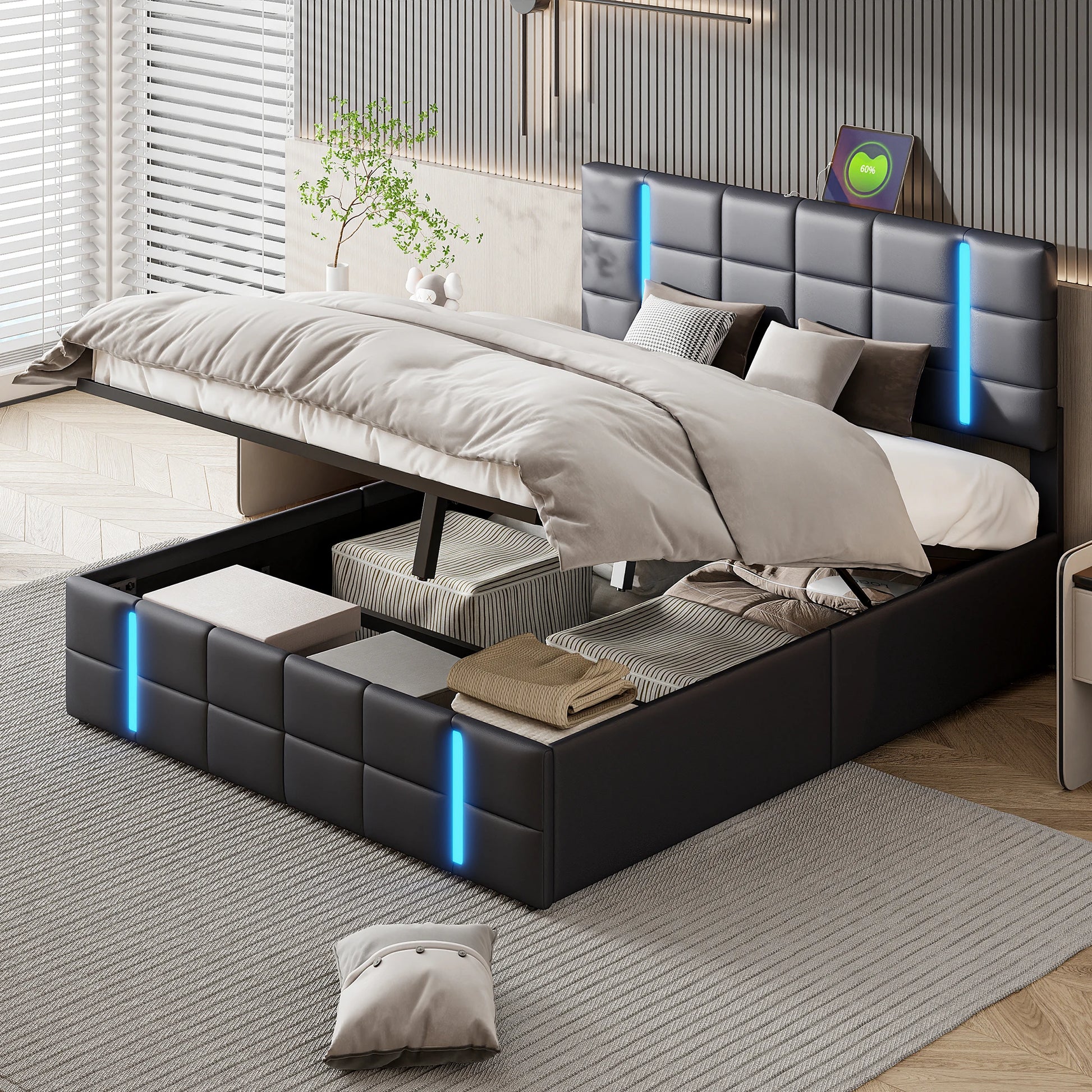 WoodenAura Polsterbett 140 x 200 CM Stauraumbett mit Type-C, LED-Licht, mit Stauraum, Doppelbett, hydraulisches Funktionsbett