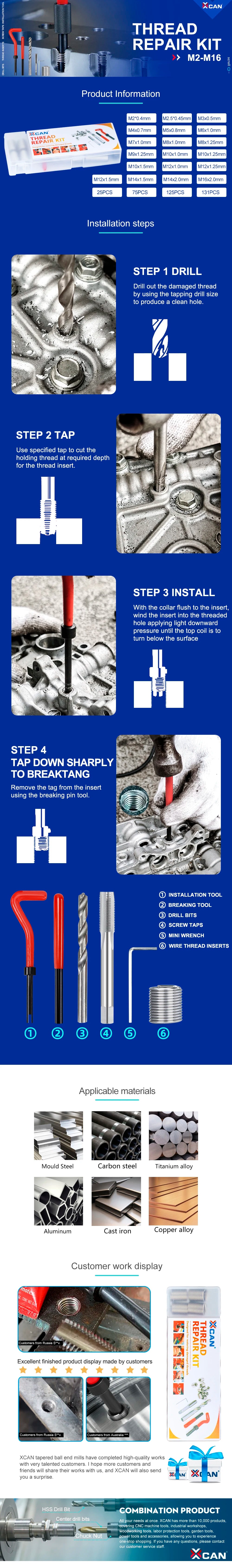 XCAN Gewindereparaturwerkzeug, 25 Stück, M3/M4/M5/M6/M7/M8/M10/M12/14 zur Wiederherstellung beschädigter Gewindeschraubenschlüssel, Spiralbohrer, Handwerkzeug