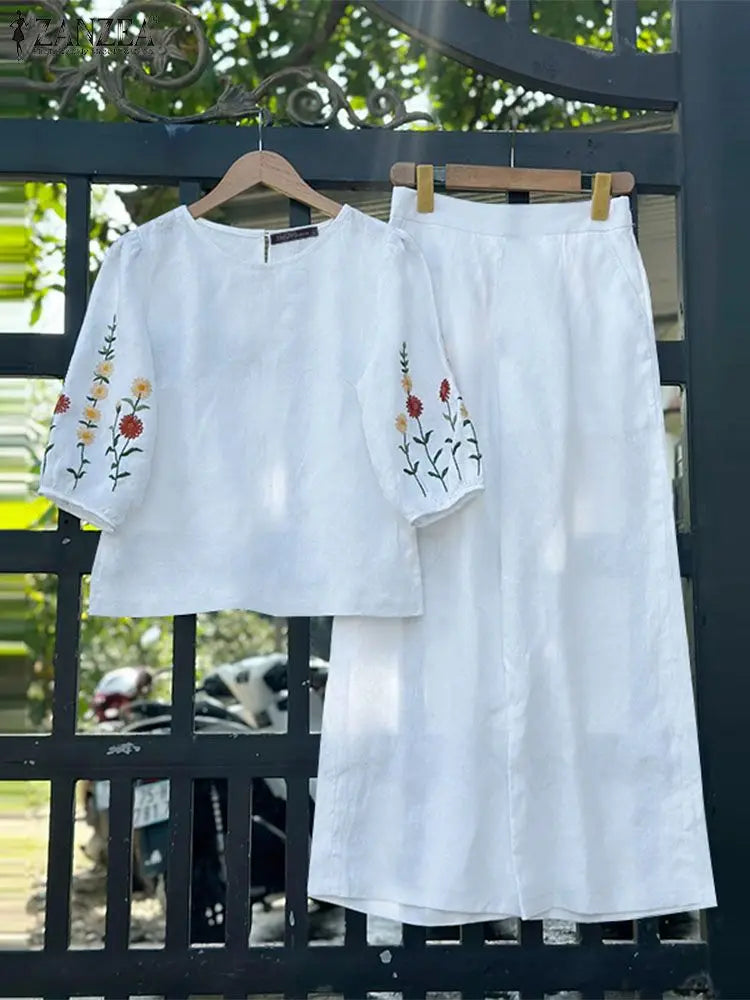ZANZEA Fashion Women 3/4 Sleeve Embroidery Blouse Pants Sets Autumn 2PCS Floral Tracksuit Casual Loose Wide Leg Trousers Suits